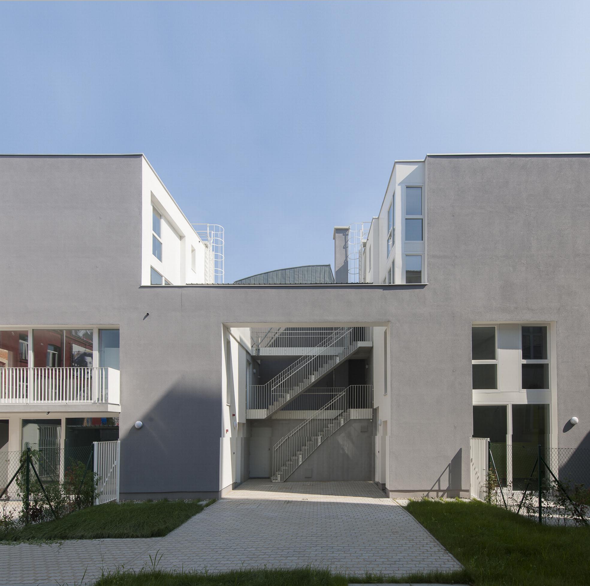 All accommodation has an outdoor area, large terrace or garden. The facades are made of plaster on insulation with a prefabricated concrete base. Despite its cut volume, the building is designed to achieve low energy performance, very close to the passive energy.