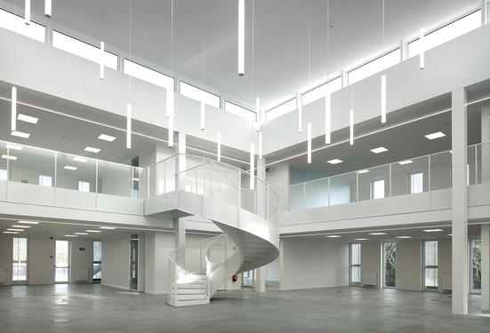 - The building expresses the will to consecrate a "place". The square shape proves to be a perfect form for its capacity to gather around a center. This is treated as a void on two levels with natural zenithal lighting: a major room but without a precise function assigned, a room in addition: informal meeting, crossings, common business activities, team building for a conference or a workshop, relaxation... By its presence alone, all the departments are in permanent contact. More prosaically, it ensures a form of compactness as well as a natural light in the heart of the project.