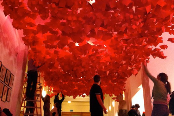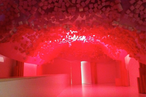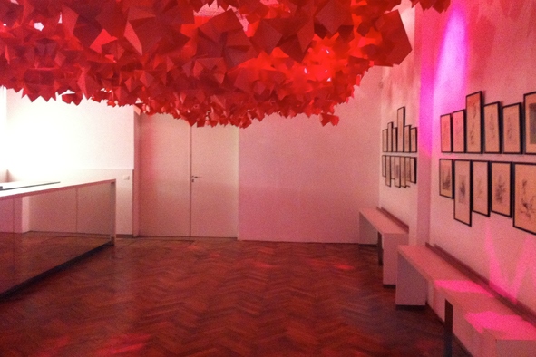 The bar of the Center for Fine Arts, built by Belgian Art Nouveau architect Victor Horta, was showcasing the result of the union. The students examined, conceived and then realized a sculptural representation of how they hear music. Using hand-folded fireproof paper, dyed pink with beetroot juice, the students have created individual works of origami, each in the form of a compass. The combined result was a dome of almost 4000 works, of varying sizes, representing the notes played by different instruments in a melody, designed to over-arch the audience during their interval discussions." Published by BOZAR