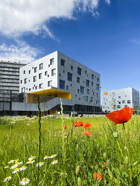 - Restructuring of a 2.1 ha site into a new eco-district comprising 1.85 ha of outdoor spaces, sports and play areas, courtyards, vegetable gardens, alleys and roads and sustainable buildings: 1 sports hall for competitions, 1 gym, 2 schools, 1 parking lot, 1 crèche and 30 housing units.[...]