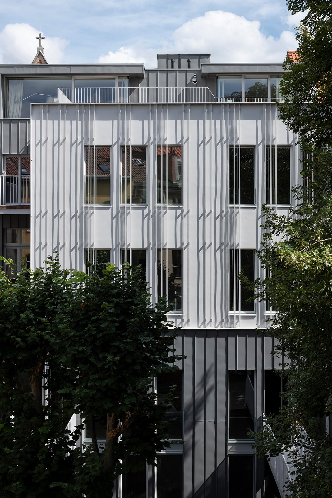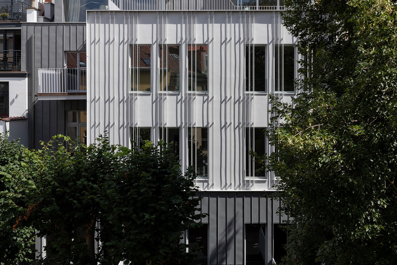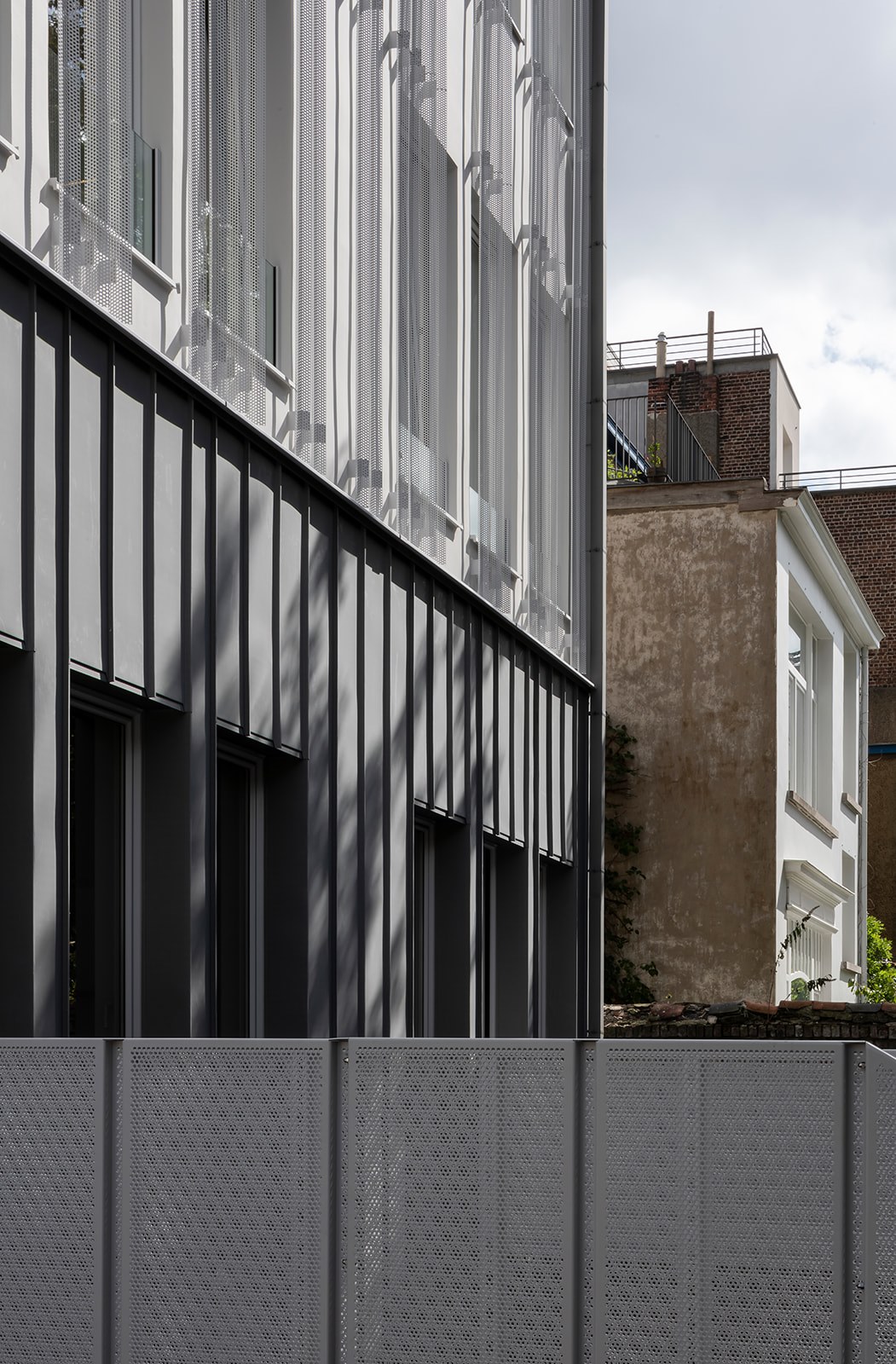 A series of vertical, lightly perforated metal sheets has also been added alongside the windows, to draw the eye of the viewer inwards towards the greenery inside the islet, and away from the neighbouring buildings.