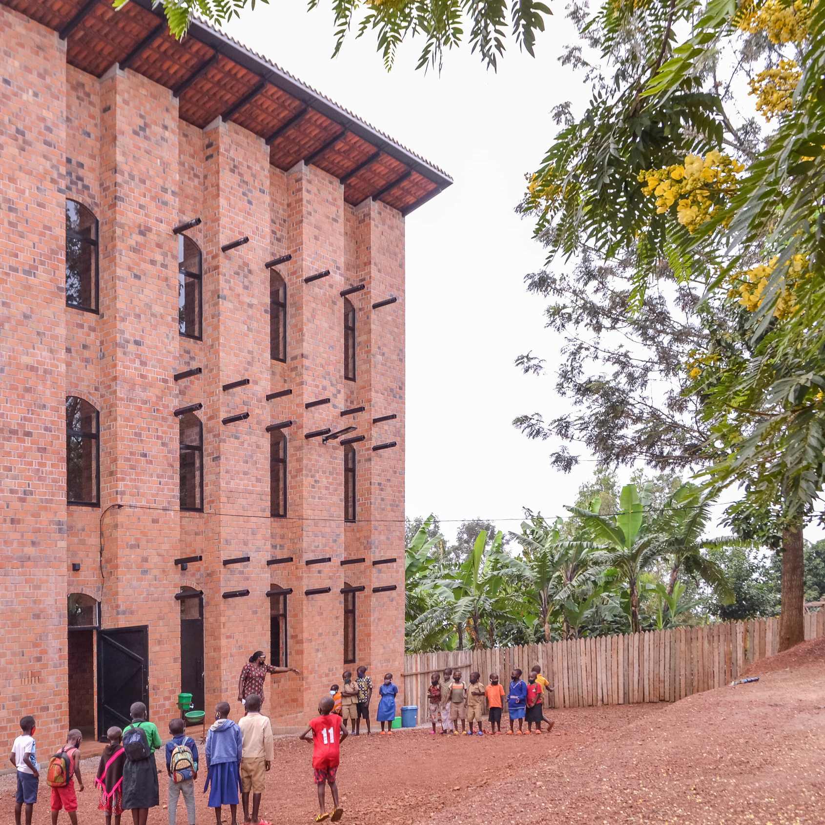 - In Rwamishiba, Rwanda, EDA-AU is building a home dedicated to education with local craftsmen. The project is initiated by a Rwandan residing in Belgium who wishes to support his adopted village. Thanks to acquaintances, he meets Arnd Amand, founder of the EDA-AU office, who is involved in this project on a voluntary basis. Together, they go to visit the country with interested stops in public schools, factories, brickyards, etc. both to identify the culture and to think of the possible ways of building. In schools, capturing the attention of children seems difficult, high temperatures or rain hammering a sheet metal roof are the reasons. While in this country also concrete is an icon of modernity difficult to dethrone, the building will favor the use of terracotta. The construction system developed with the engineer Cédric Evrard hybridizes traditional know-how and modern techniques (“row lock bond wall” method). The load-bearing walls made of narrow bricks (H.10 x W.5.5 x L.21cm) are hollow, they regulate the heat and allow cables and pipes to pass through. Concrete columns in these same voids make it possible to connect foundations, walls and floors. The workforce, all qualified for the construction of massive walls, is trained by the brother of the architect, Benoît Amand, chief mason. The participatory dimension on the site, born of the accompanied implementation, consolidates the happy reception of the home.[...]