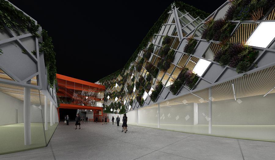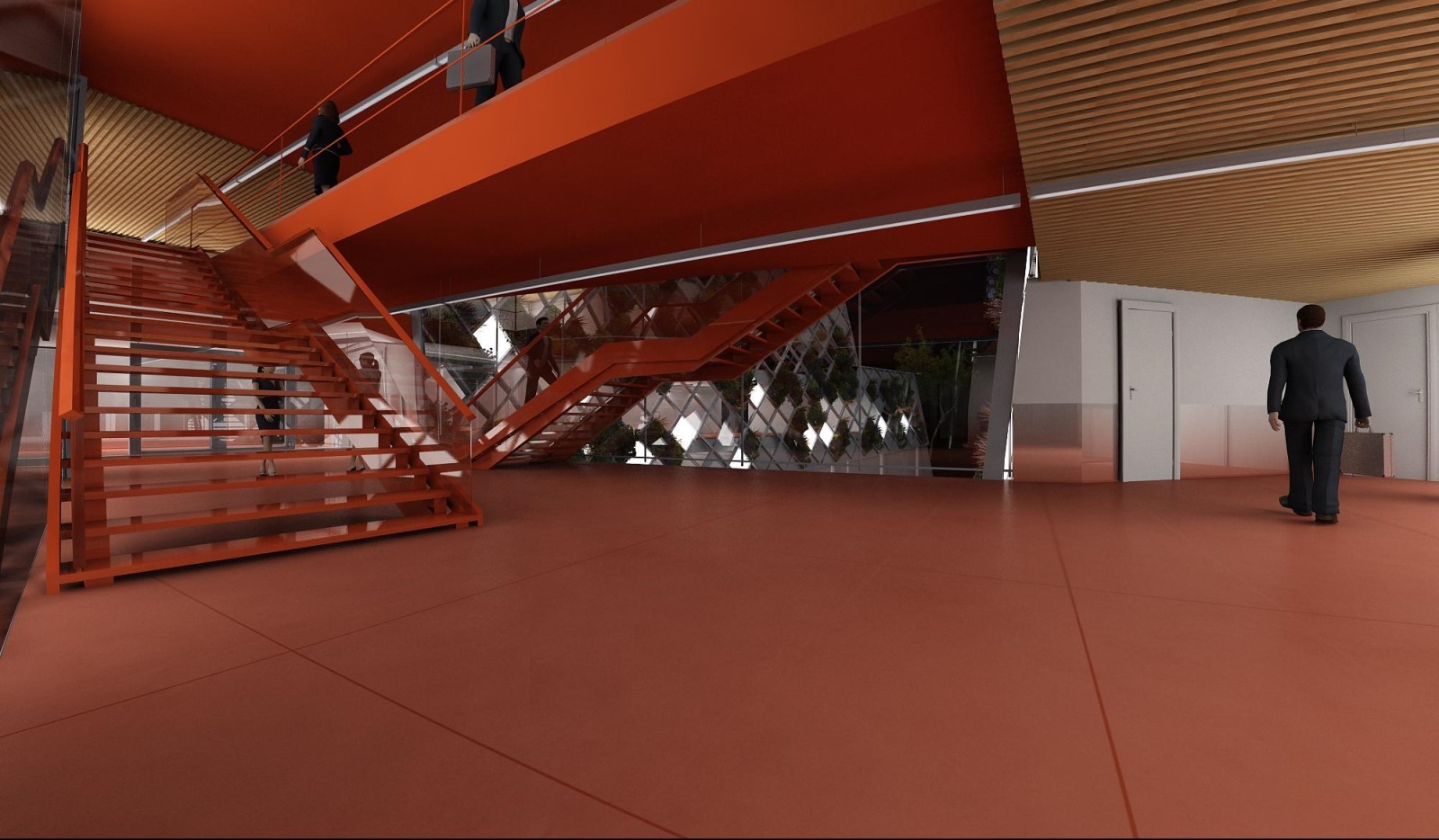 - " The international competition asked participants to design a new city hall to accommodate office spaces for central administration, archives and mixed use areas. The project is divided into two major forms that bookend a public open courtyard. Connected by a bright red bridge, the two arms house the major program areas and open to a landscaped area for the public to enjoy. The geometric form offers a break from the surrounding structures, emphasizing the importance of this communal structure. The faceted facade fuses the natural and the synthetic as sections of greenery are scattered among sections of glass. Inside, bright warm colors greet workers, a drastic change from the typical office color palette."[...]