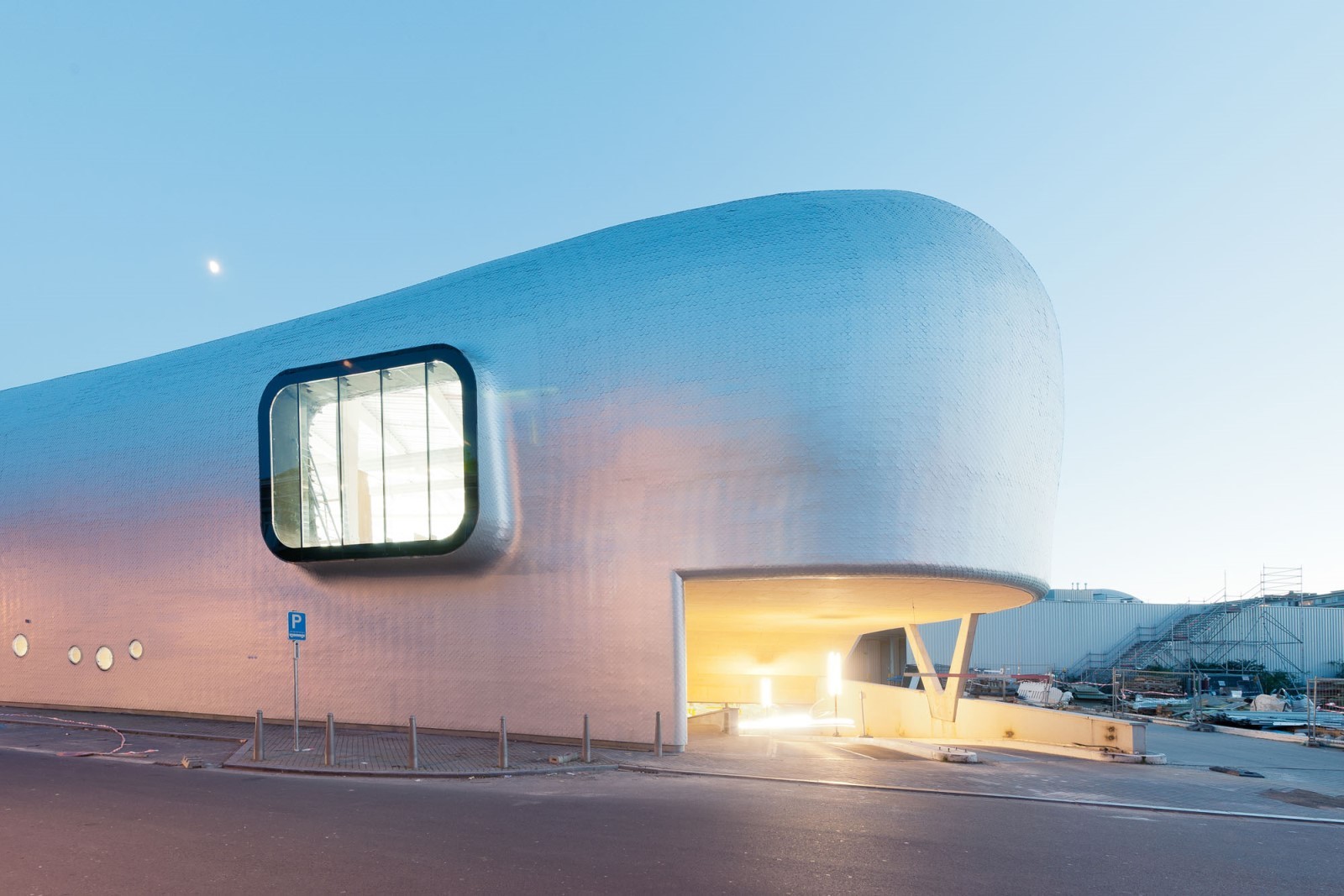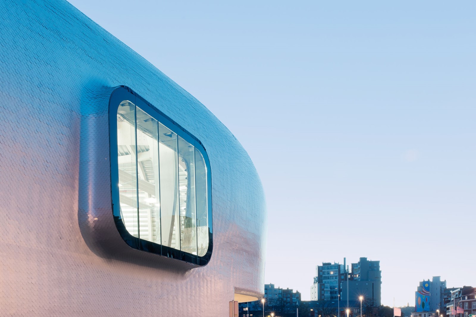 The new ice rink of Liège is embedded into a crevice of the Médiacité, private real estate development project which came to redevelop a former industrial site on the right bank of the Meuse. It inherits several constraints that it clarifies in an autonomous and unitary form, until incorporating the access to the mall's car park in its climax: the whale’s head.