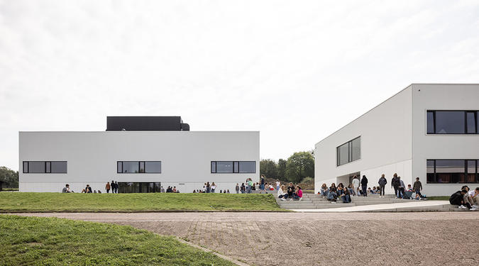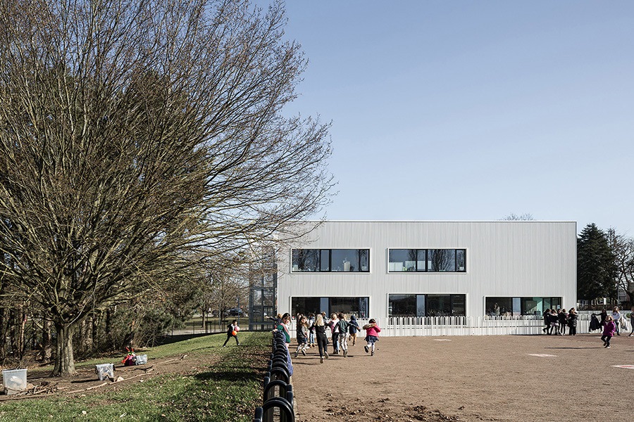 The aim was to extend the secondary education section, create a new kindergarten and create a second sports hall while preserving the spirit of the original school campus. Each of the three buildings is designed on a square plan to ensure compactness. The structure of each building is rational, simple and efficient.