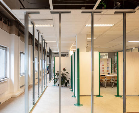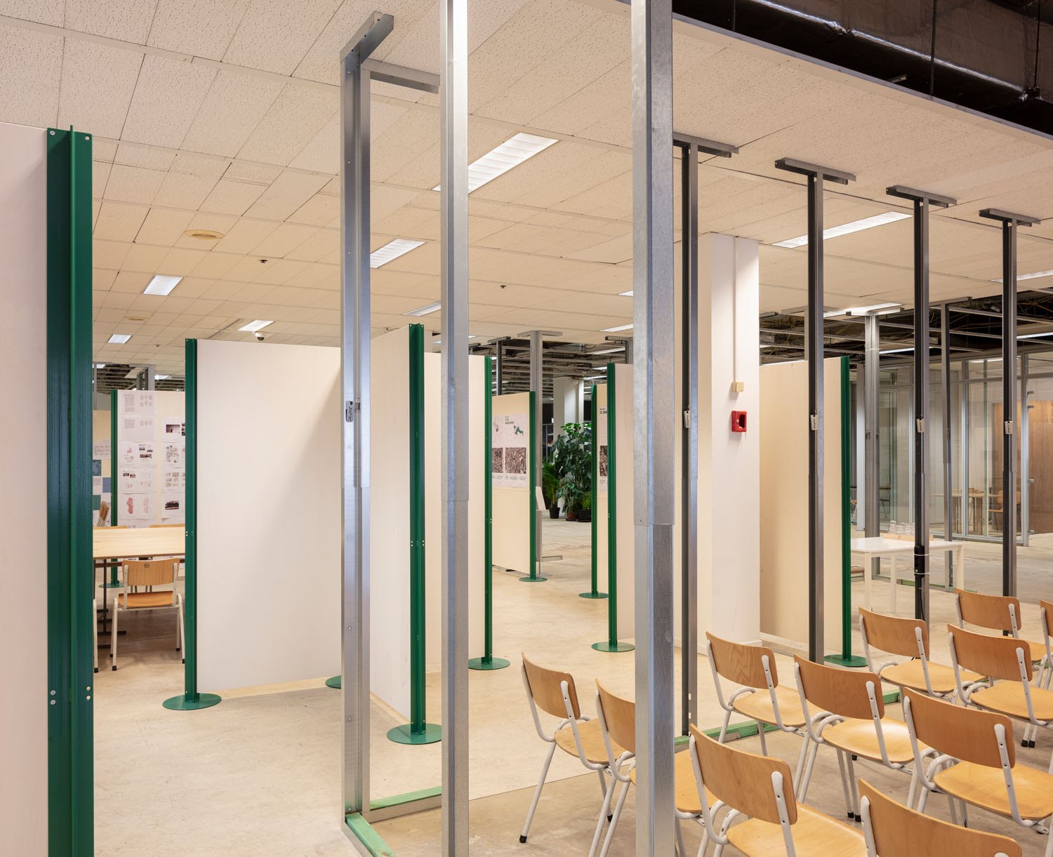 On the left a stretched passage between the confrance space and a meetingroom. Seperated from the workshopspace by paravants, which are used as displays.? Michiel De Cleene