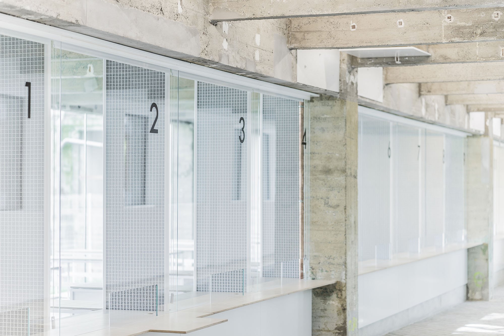 To enhance the accessible nature of this public service, the waiting room is designed as the extension of the street; an in-between space which can be experienced as a part of the city. The counters are organized in a repetitive way, aligned with the concrete beams. They offer room and storage for an effective treatment of the citizen requests.