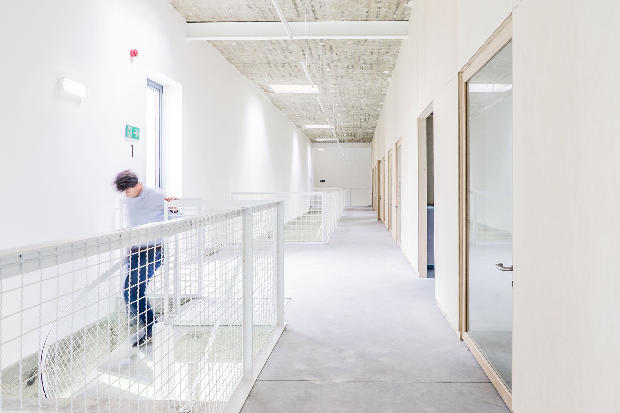 The assignment for the competition was to transform an industrial site into a local city-hall branch including a waiting room, 12 counters and administration offices. The existing building used to be part of a complex for the production of cigarettes, which has been largely demolished in the past decades. Nowadays only two volumes remain along the rue Charles Malis.