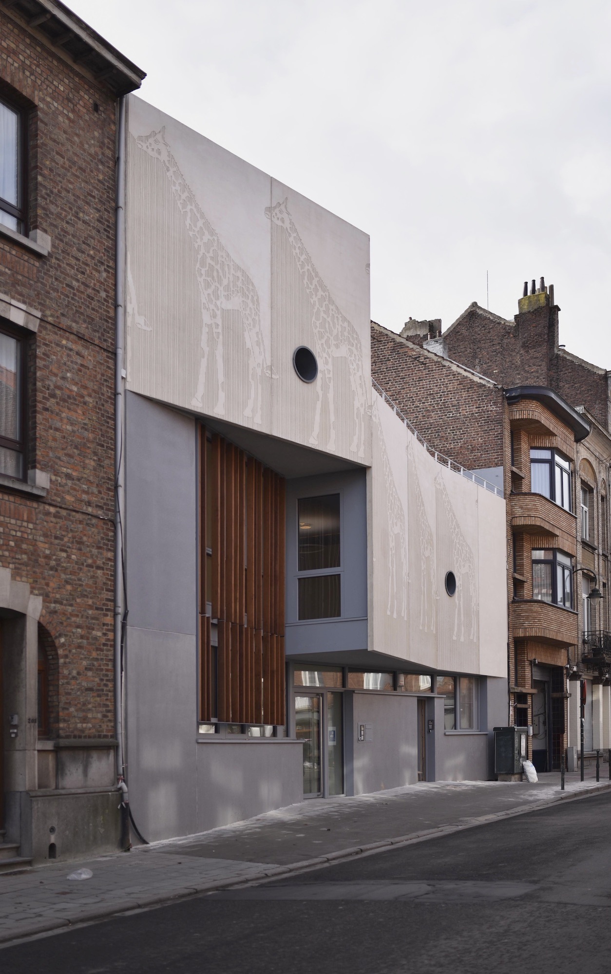 - The project is built on a deep, north-south oriented urban plot. The dense neighborhood is largely composed of dwellings: Brussels houses of 3 and 4 floors follow the urban alignment and some apartment buildings of 4 or 5 floors appear in the corner or between neighbors. A lack of visual unity results from these different sizes, but also from the scattered breathing spaces that punctuate the block. The proposal is therefore articulated around this existing mesh. On the street side, the building is implanted between the adjoining buildings while respecting the alignment in order to adapt to one of its neighbors. At the rear, it extends on the first floor over the entire depth of the plot. With a series of patios, it accompanies the neighboring buildings that extend into the block, while respecting their sunlight and views. The challenge: to make a full circuit on two levels. To avoid the use of the elevator, the project creates an initiatory path for the child: a ramp allows the child to wander through the building and links the different units, passing from the interior to the exterior (different patios). Each patio develops a theme adapted to its situation. The path is for the child's use, as is the route, marked out by gardens and "houses" at his or her size. Each house is a unit, each treated in a particular way given its dimensions and openings.[...]