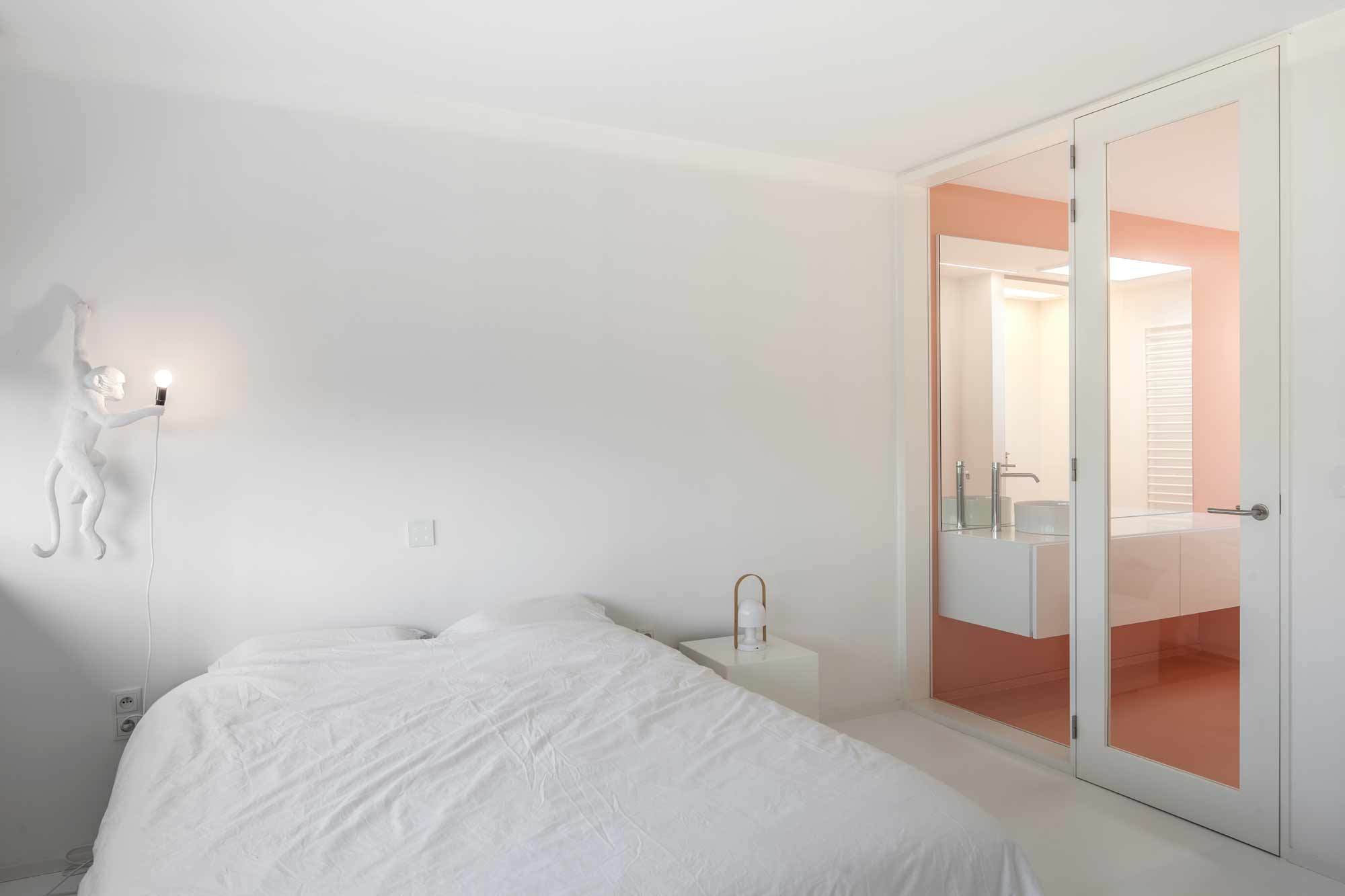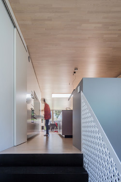 The interior is dressed with natural materials, contrasting with the rigor of the exterior architecture. The basement is made entirely of precast concrete. The ground floor is covered from floor to ceiling with boards of light ash wood. Light colors have been applied to the walls and floor in order to optimize lighting and increase the brightness.