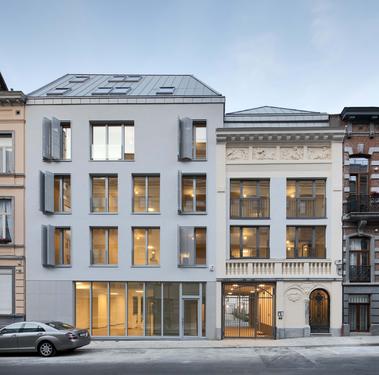The redevelopment of the rear building of 3 levels into 7 artists' studios open to temporary residence and associated with an exhibition space on the street side corresponds to the program of the Commune of Ixelles. The program is complemented by the realization of 16 housing units for the Fonds du logement.