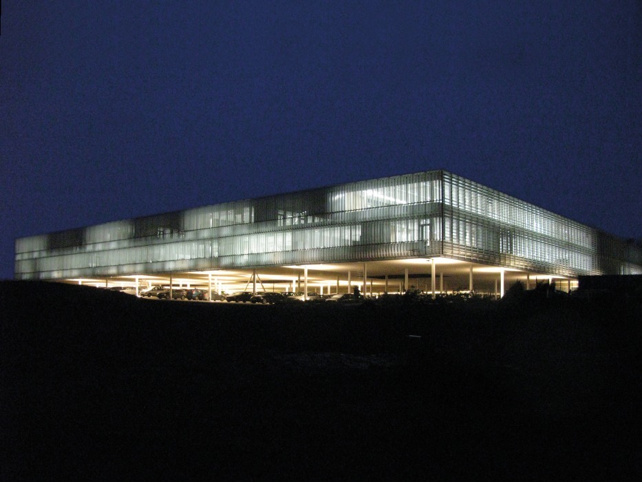 Slipped under the offices following the natural gentle slope (1,5-2,5 %), the parking area is discreetly positioned under the building, preserving the surrounding landscape which is covered with greenery (mown lawns and meadows of flowers) and a scattering of fine oaks.