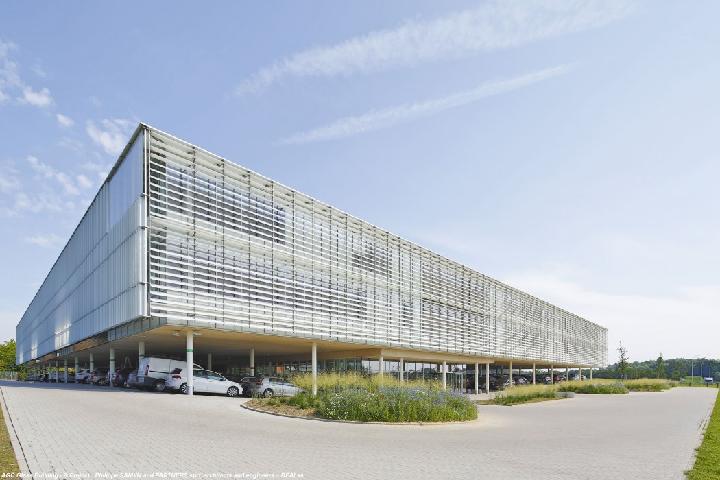 - The building follows the route of the N4 highway, respecting the natural landforms. The building is standing on stilts and floating above the rolling landscape. This gives a better view from the E411 motorway and the N4. Its orientation is slightly off-kilter in terms of cardinal points (15°) although this guarantees an excellent amount of sunshine. Pedestrian and automobile pathways enter from opposite ends of the grounds but come together again south of the building where the glazed entrance hall welcomes AGC staff and visitors.[...]