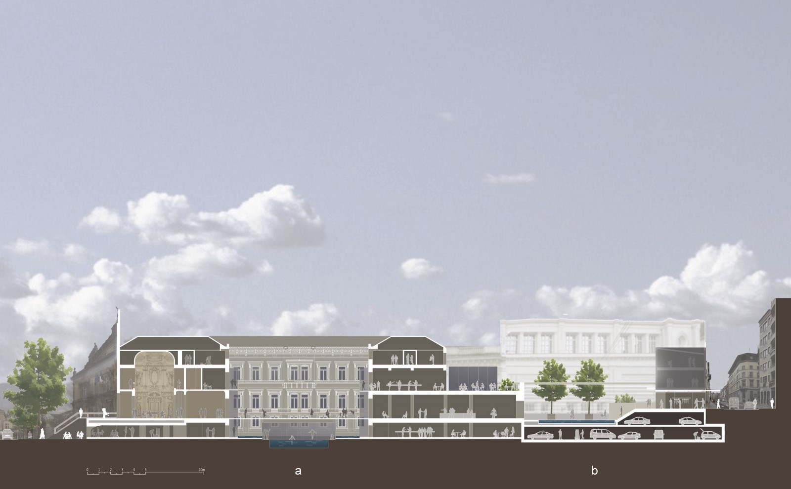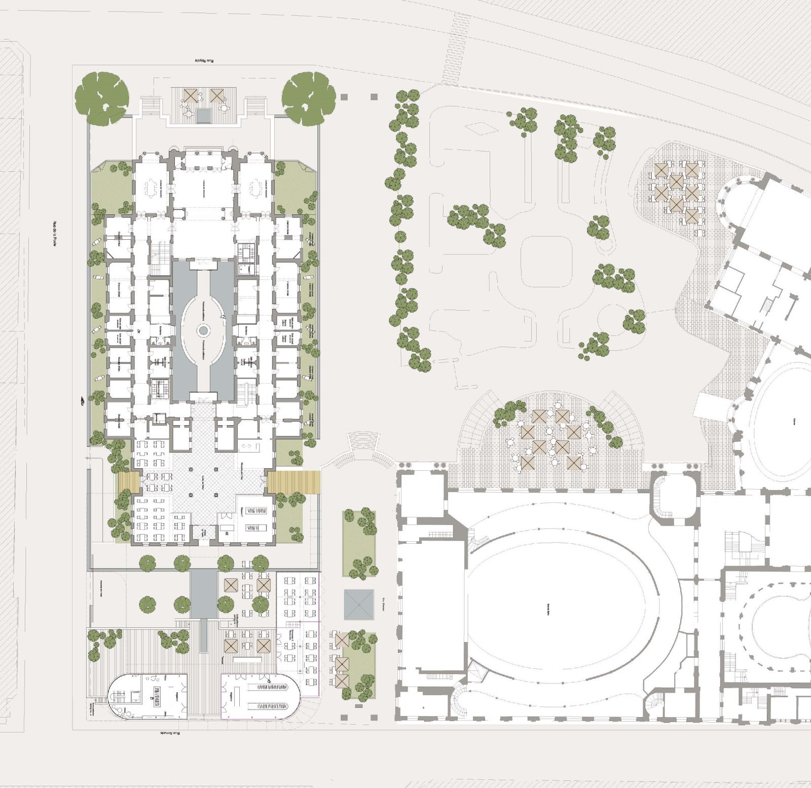 The historical structure, symmetrically built around a central axis, is restored with a view to bring light and transparency into the heart of the project. The majestic entrance and the reception rooms are restored and given a half-public function, while the entrance to the hotel is moved to the rear of the building, where the entrance to the thermal springs used to be found. The ‘recto-verso principle’ by Léon Suys is in this way honoured again. A new construction at street-front is built, redefining the building block and offering a green patio in the centre of the complex.