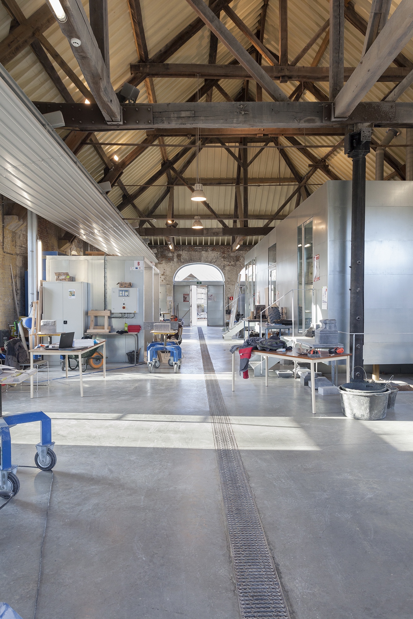 Our approach combined the careful preservation of any existing trace and artifact, left as found, with the transformative insertion of new architectural devices responding to new circulation, comfort, use and environmental requirements: the steel box in the 1843 Grande Scierie, the wooden cladding of the cafeteria in the Huile & Clos building, the pixelated overhang joining it with the new workshops wing, the internal staircase in the Ménuserie et Forge building, the external staircase and the internal vertical shaft in the Bureau building.