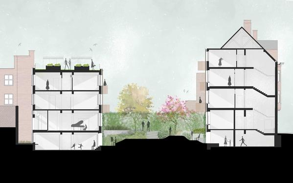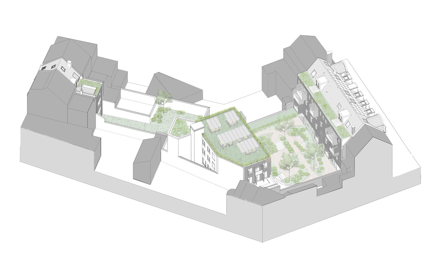 - The co-housing project is the result of the transformation of 3 buildings in Schaerbeek: the former Spanish Embassy (a remarkable building by architect Michel Polak), a typical Brussels mansion and an industrial building inside a block. The 2000 m² of accommodation, dedicated for 17 individual units (including 2 affordable rental unit), are supplemented by 450 m² of common spaces: 1 common room, 2 laundries, 1 bicycle storage room & workshop, 2 gardens & vegetable patches, 2 guests rooms, ...[...]