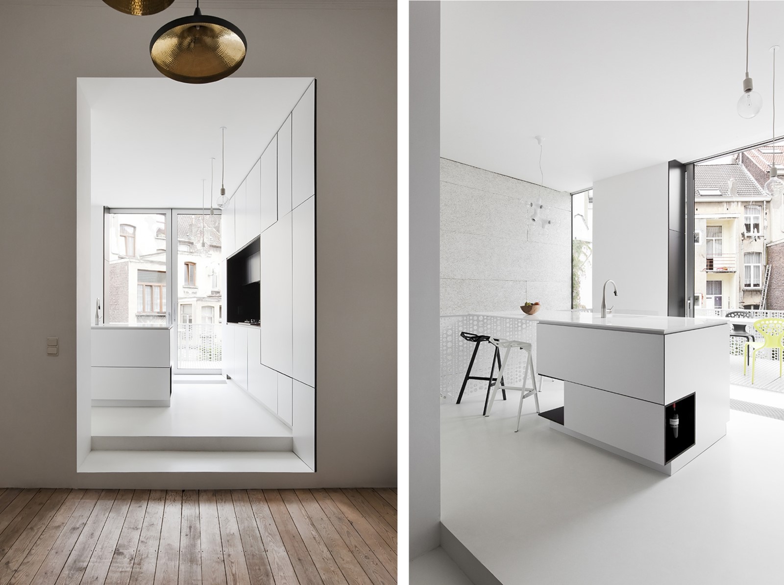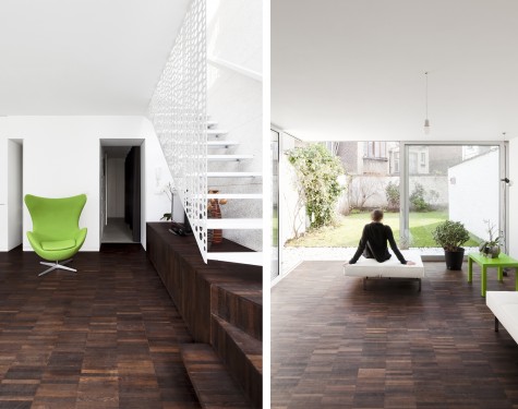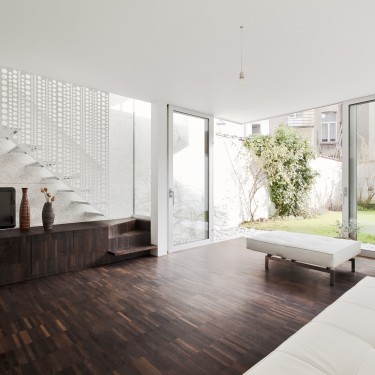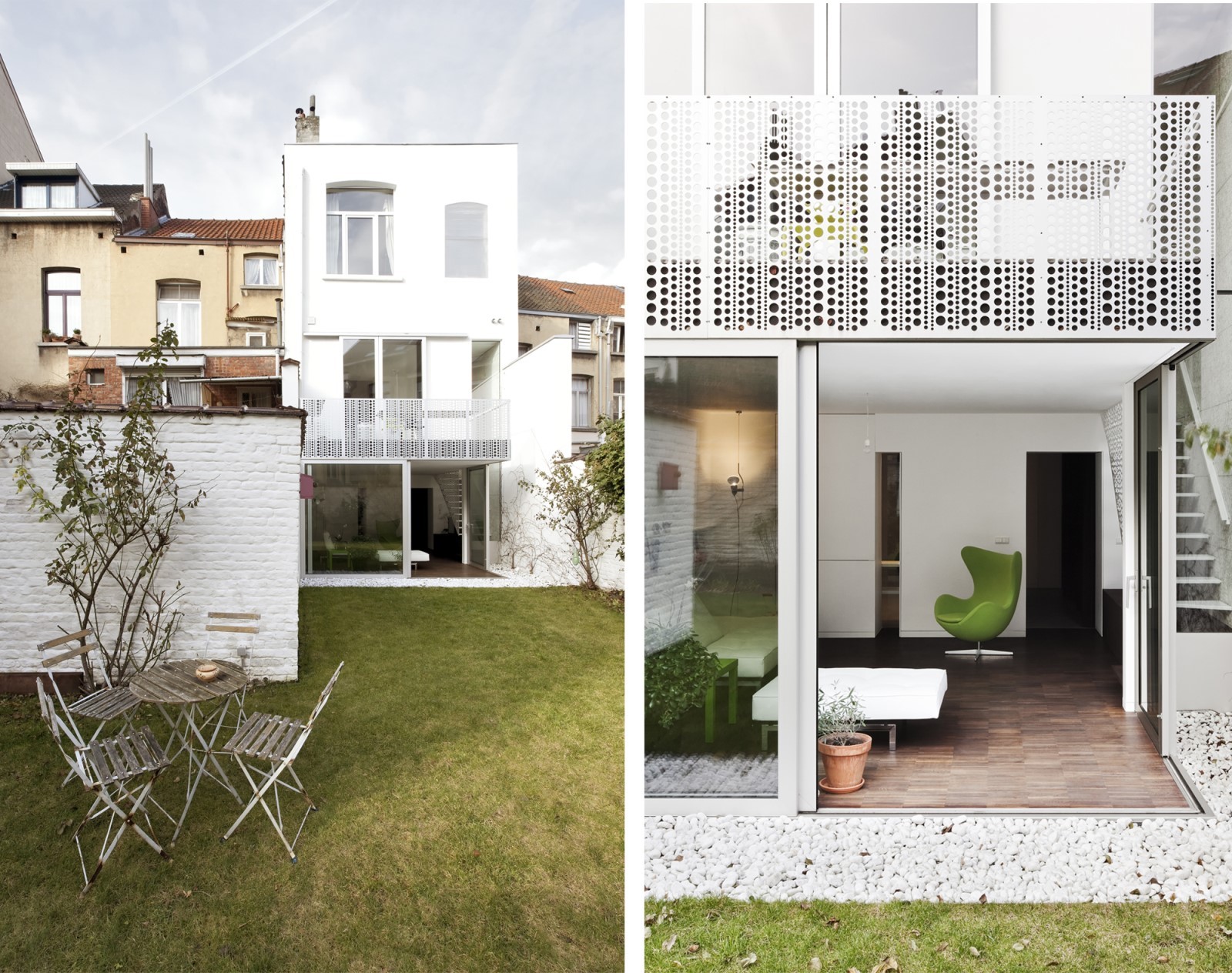 - The triplex takes advantage of the garden by orientating the living area towards it. The former basement-kitchen is completely refurbished and an extension allows enlarging the living room to the garden. A terrace situated on the roof of the living room is directly linked to the kitchen on the ground floor. The entire renovation aims at simplicity and respect of the building’s typology. Minor interventions on the main building work allow reducing the costs while special attention is given to the different perspectives and openings between areas. Looking for innovative and low-cost details gives a personal and refreshing touch to the project. The most representative illustration of this approach is the work on the guard rails, which are stamped through by means of rows of holes of different diameters allowing reinterpreting an industrial process in a more fun way, while maintaining a low cost. The choice of materials and their alternative uses (wood fibres panels, aluminium, wood, laminate mdf for the kitchen white on the one side and black on the other, sliding window frames on the frontage opening entirely the window bay. ..) bring in this traditional house much poetry, comfort, and an appealing link to contemporary interferences.[...]
