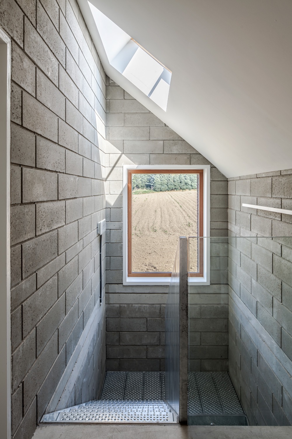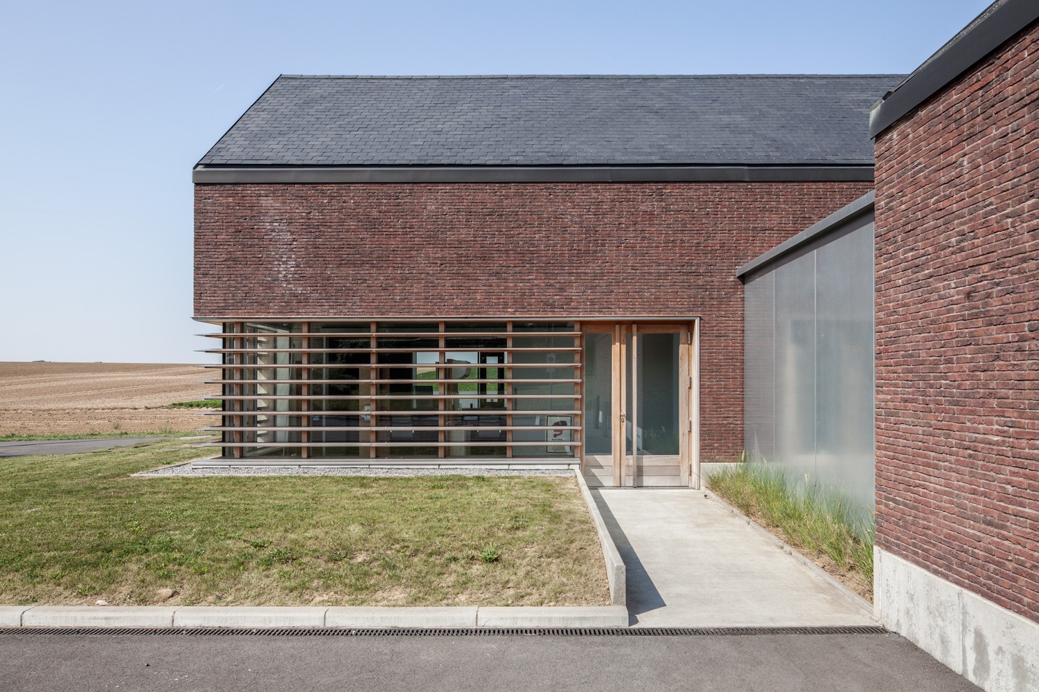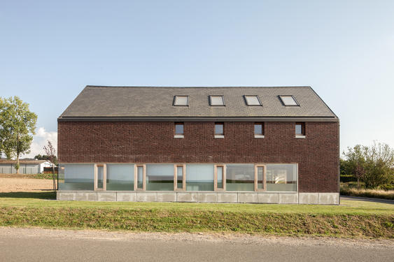 - This project for small local businesses questions how semi-industrial economic activity can fit into a rural environment. Located along a small country road, in the immediate vicinity of vast fields, the building revisits the typology of local buildings : simple volumes on courtyard, brick masonry, raw materials ...The ensemble develops in two perpendicular volumes that interact with an adjacent slope to create a space protected from the glances where the company's activities take place. The modest masts of the ensemble fit loosely into the local landscape by recreating a built-up street front. The long bay street window supports the linearity of the volume and its longitudinal anchoring. It also offers a panoramic view on the agricultural landscape facing it. The connecting volume is clad in galvanized steel panels reminiscent of the old metal doors of surrounding farm buildings.The simplicity of the exteriors volumes is prolonged inside by the deliberate choice to preserve the apparent building materials (exposed concrete, apparent techniques ...), thus subtly reminding users of the agricultural world harshness in which the building is inserted.The result is a simple and discreet architecture, efficient and open to multiple uses that this building is likely to accommodate, a peasant architecture in the noble sense of the term.[...]