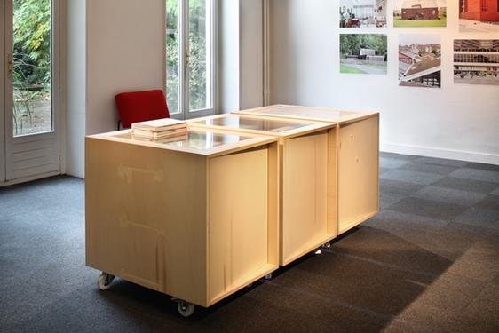 Three pieces of furniture, each measuring 55 cm wide, 68 cm long and 80 cm high on castors, form a unit in which the stock of books is stored and on which some works are available for consultation. During transport, assembly and dismantling of the exhibition, they also serve as transport and storage for the posters.