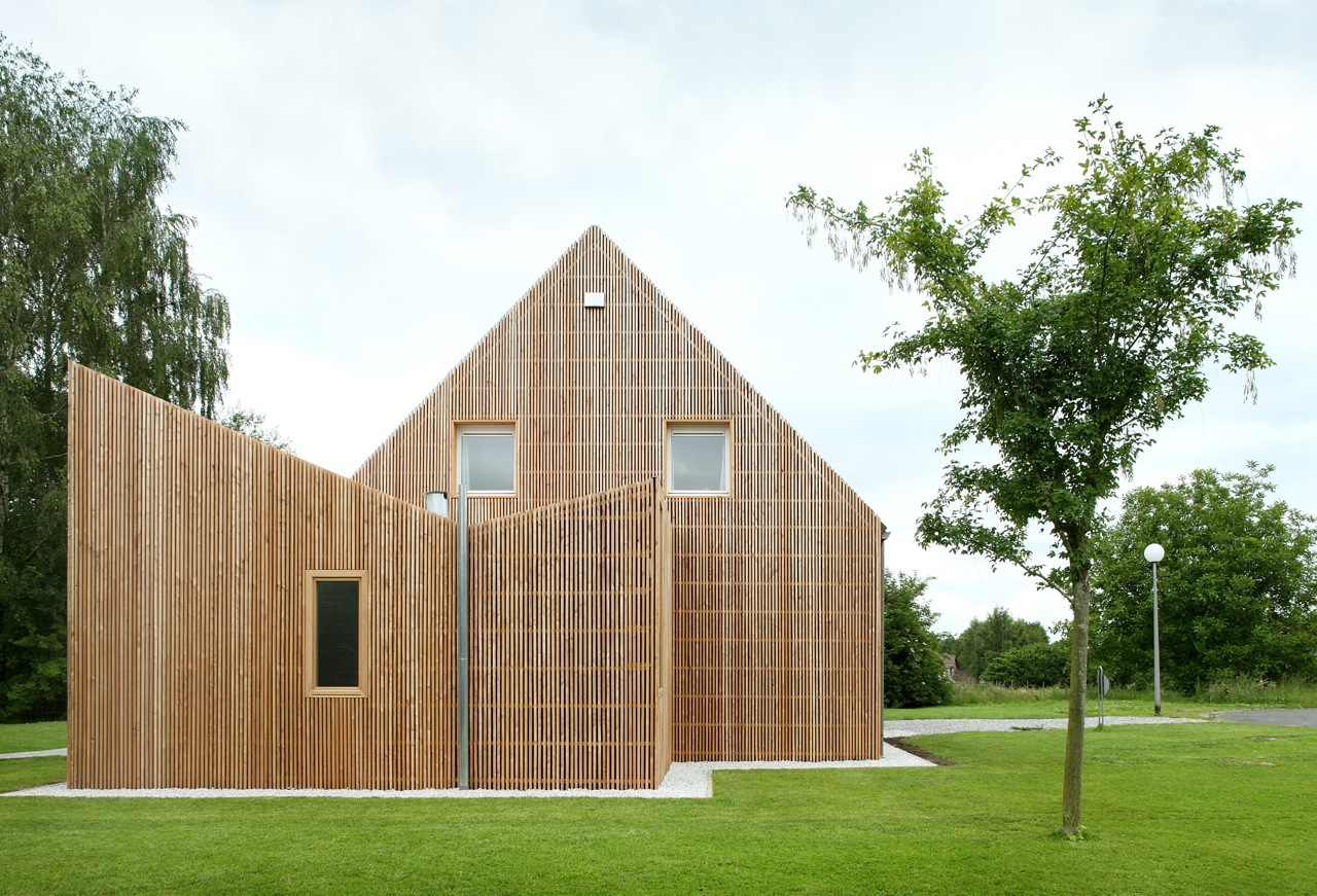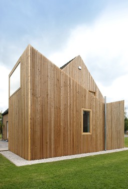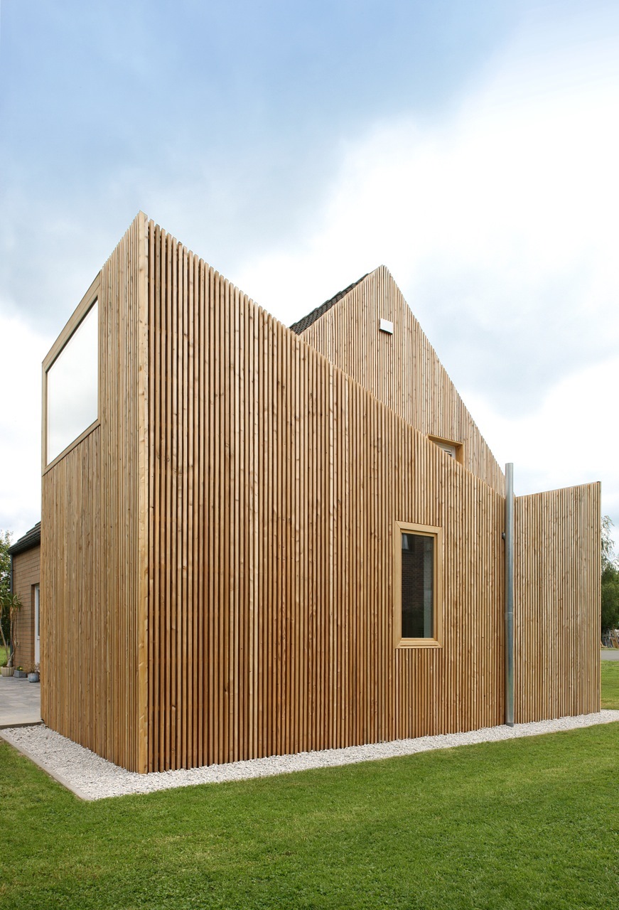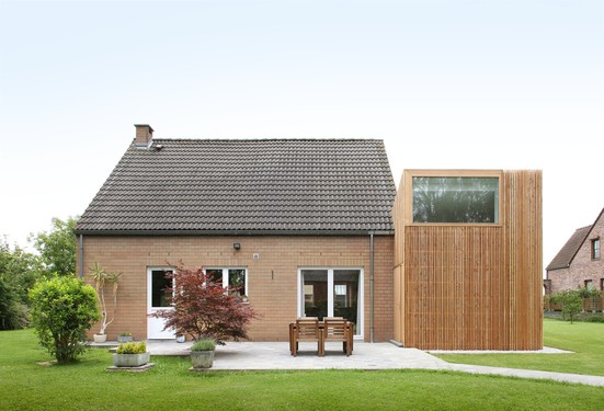 This particular house had become too small for its owner who wished to expand his living space. Thus the request was limited to one extra room. Our response draws inspiration from the existing house in order to create contrast: an inverted roof in opposition with the existing traditional roof, less ordinary window framing for specific views on the oustide environment, a wooden structure rather than the older masonry. In the end, this extension creates a dialogue between old and new trhough opposition: a wooden cabin grafted onto the home, a traditional construction attached to the very image of standardized habitat.