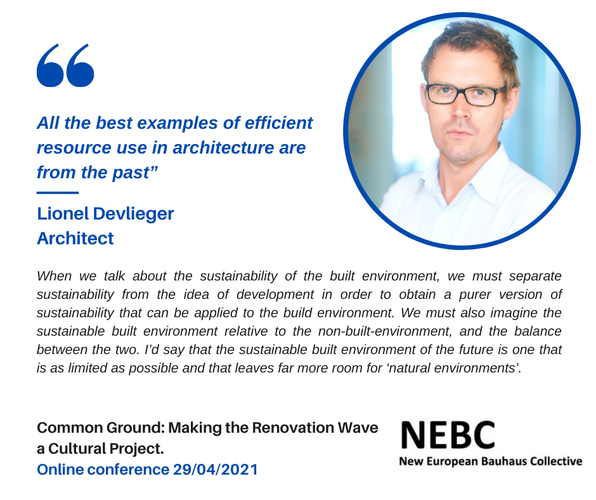 L. Devlieger (Rotor): Keynote speaker NEBC online conferenceLooking forward to listening to one of the keynote speakers Lionel Devlieger, architect, historian and project leader at ROTOR a Brussels-based organisation specialised in the study of present day material culture in the frame of the #NEBC online conference 'Common Ground: Making the #RenovationWave a Cultural Project' on Thursday 29 April 2021 from 10 am to 4pm CET..
