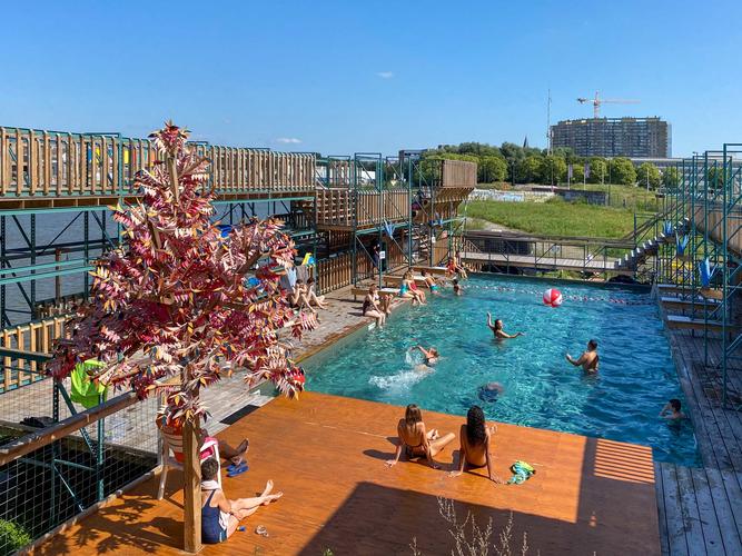 Pool is cool/FLOW: Finalist of the the European Prize for urban public spaFlow, designed and built with the participation of fifty young people, is the first open-air swimming pool to be constructed in Brussels in forty years. This project introduces a temporary structure that establishes a rich meeting place for enjoying fresh air and water. As a simple, economical, modular system that can easily be built by many hands, it presents a good example of how everyone can participate in creating an active, healthy public space.
