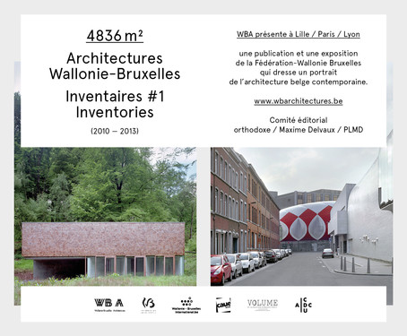 Exposition 4836 m2 et conférence par l'Escaut et V+ à ParisLa Librairie Volume et Wallonie-Bruxelles Architectures invitent l'architecture belge à s’exposer à Paris. Ne manquez pas la conférence d'ouverture le jeudi 8 janvier à 18h avec les architectes des bureaux bruxellois l'Escaut (David Crambert) et V+ vers plus de bien-être (Jörn Aram Bihain). Ils seront introduits par l'architecte français Sébastien Martinez Barat.Après avoir été présentée à Bruxelles et Lille, et avant Lyon, l’exposition 4836 m² - Architectures Wallonie-Bruxelles Inventaires #1 Inventories fait étape du 9 au 31 janvier 2015 à la Librairie Volume à Paris.Douze photographies extraites de l'ouvrage Architectures Wallonie-Bruxelles Inventaires #1 Inventories (2010-2013) créé par la Cellule architecture de la Fédération Wallonie-Bruxelles et par WBA sont reproduites dans l’exposition et imprimée sur 4836 m² d’affiches à emporter. Des exemplaires du livre sont consultables sur place.Fichiers