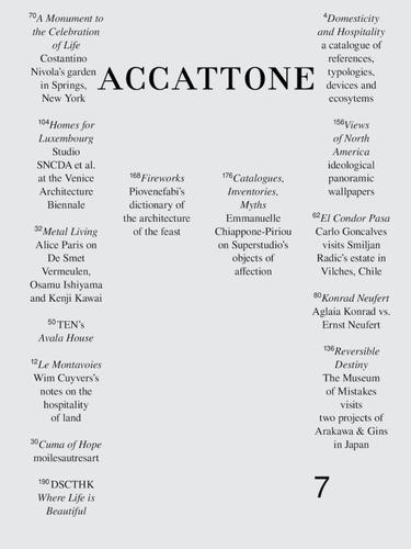 Accattone #7 traite de la domesticité en plein air et de l'hospitalité diplomatique de la terre.Il présente des projets intellectuels et architecturaux, tant contemporains qu'historiques, pour des modes de vie alternatifs.