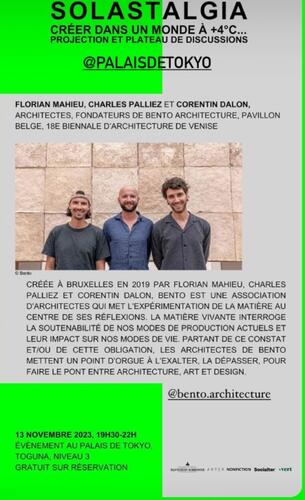 Bento : Solastalgia — Créer dans un monde à +4°C – ParisLes membres de Bento figure parmi les personnes qui prendront la parole au Palais de Tokyo le 13 novembre prochain à l'occasion de Solastalgia.