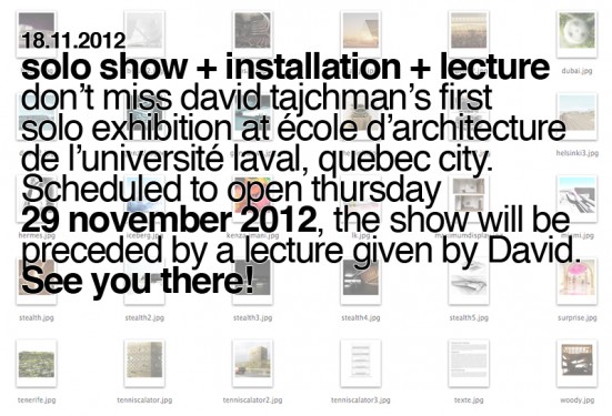 Conférence de David Tajchman et lancement d'expositionDavid Tajchman donne une conférence à l'Auditorium 2117 de l'École d'architecture de l'Université Laval le jeudi 29 novembre à 17 h 30.