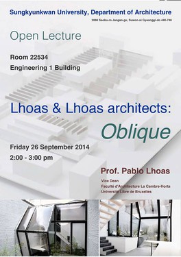 Conférence de Pablo Lhoas à SéoulPablo Lhoas, du bureau bruxellois Lhoas & Lhoas Architectes, donnera une conférence le vendredi 26 septembre à Séoul.Le thème de cette conférence qui se tiendra à la faculté d'architecture de l'université Sungkyunkwan à l'invitation de Prof. Dr. Ing Thorsten Schuetze est l'oblique.