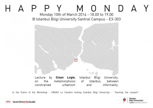 Conférence par Sinan Logie sur les métamorphoses urbaines d'IstanbulDans le cadre du workshop organisé entre l'ENSAV La Cambre et l'Université de Bilgi d'Istanbul, Sinan Logie donne une conférence consacrée aux métamorphoses urbaines d'Istanbul le 10 mars à 18h.Le workshop concerne 3 espaces denses et centraux du district of Beyoğlu. Il s'agit de 3 espaces publics réservé à l'usage de la voiture.- Derrière la Galatasaray School- L'accès au métro Şişhane/Tünel- A l'entrée du Dolmabahçe Palace.Le but du workshop est de récupérer de l'espace actuellement consacré à la voiture pour le rendre aux usagers de la ville.