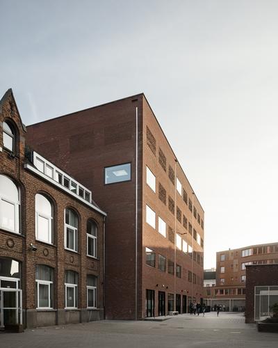Si les volumes empruntent le matériau de la brique au vocabulaire de l’architecture scolaire, leurs allures artisanales, gabarits droits, rythmes réguliers, brouillent la généalogie de cet îlot et semblent hérité d’un âge révolu. Amusant quand on sait que le programme porté par le ministère de l’éducation flamand s’appelle «école de demain». Via des procédures qui associe dès l’avant-projet architectes et entreprise de construction, il se conduit selon une métrique très contrôlée. Les matériaux mis en œuvre sont donc modestes et sobrement accordés. Ils confèrent une sorte de fausse banalité aux atmosphères intérieures. Mais chaque fois, les éléments d’architecture et les espaces ont été dessinés avec une générosité qui dépasse le pragmatisme des revêtements. Un couloir très large, des impostes toutes vitrées, des circulations verticales en éclairage direct et finalement, des fenêtres de très grandes dimensions. A cela s’ajoute un ensemble de petits édicules, barrières, rampes, escaliers, porches et préaux. Des pivots et des filtres qui rendent confortables les parcours et les séjours des centaines d’élèves et enseignants d’une cour à l’autre, de la maison à la classe, du vélo au banc d’école. Ils se collent aux voisins, mêlant leur briques à l’ancien avec amusement.En façade, on retrouve les grandes baies dans une trame borgne qui mimique à l’envie les empreintes rejointoyées de fenêtres jamais ouvertes. Ce sont ces fenêtres qui apportent le caractère institutionnel des deux édifices et les marquent du sceau de la même intervention, comme pour tout de même les discerner des actions précédentes. Une architecture resserrée à l’expression de ses murs qui porte avec peu le souffle d’un travail espiègle, se jouant du contexte et des contraintes pour produire par-delà la forme un ensemble bien composé.