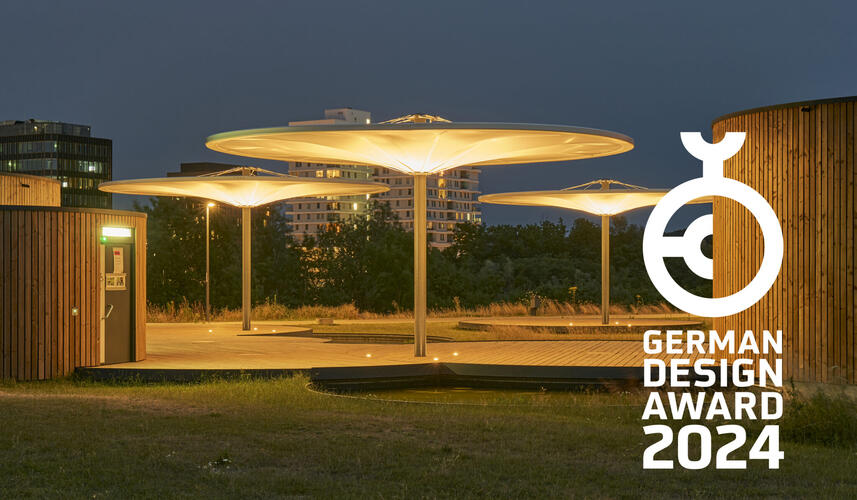 Ney&Partners : Pavilion Park Um Belval lauréat du German Design Award (LUX)© David AngelettiLe Pavillon Belval est l'un des lauréats de la catégorie Architecture conceptuelle du célèbre prix allemand du design. Le pavillon et l'installation immersive ont été ouverts en 2023 à des fins récréatives et éducatives sur le site de cette source d'eau minérale à Belval. Au début du 20e siècle, il était connu dans le monde entier pour son pouvoir de guérison exceptionnel. Le collectif BeBunch a travaillé avec l'architecte-artiste Laura Mannelli pour débloquer l'histoire du printemps. L'environnement récréatif devait également offrir des aires de repos, un restaurant et des installations sanitaires. L'installation est composée de plusieurs pavillons en bois ronds et plateaux recouverts de parasols. Ney & Partners a aidé l'équipe dans les études structurales des pavillons ainsi que dans la conception des structures parasols. Ils se composent d'une surface ondulante en tissu hautement translucide et comportent une « roue rayon » de support suspendue sur la colonne, créant un visuel distinctif. Tout en fournissant des protections météorologiques aux visiteurs, les parasols servent de point focal lors des événements récréatifs et se transforment en une étape vivante au besoin.