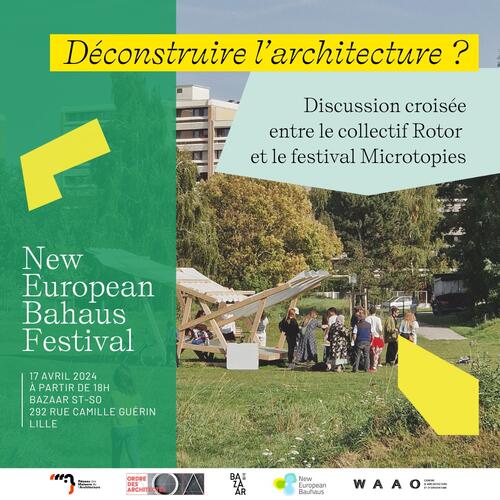 Rotor : Conférence à LilleDéconstruire l’architecture ? – Discussion croisée entre le collectif Rotor et le festival Microtopies, le 17 avril 2024 à 18h30 au Bazaar ST-So à Lille