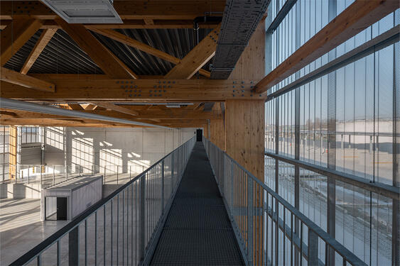 La structure en bois, avec ses fermes et ses planchers CLT, réduit l'empreinte carbone et offre une flexibilité modulaire. Les fermes en bois se transforment en une grande structure en treillis le long du Canal, formant une interface urbaine distinctive.