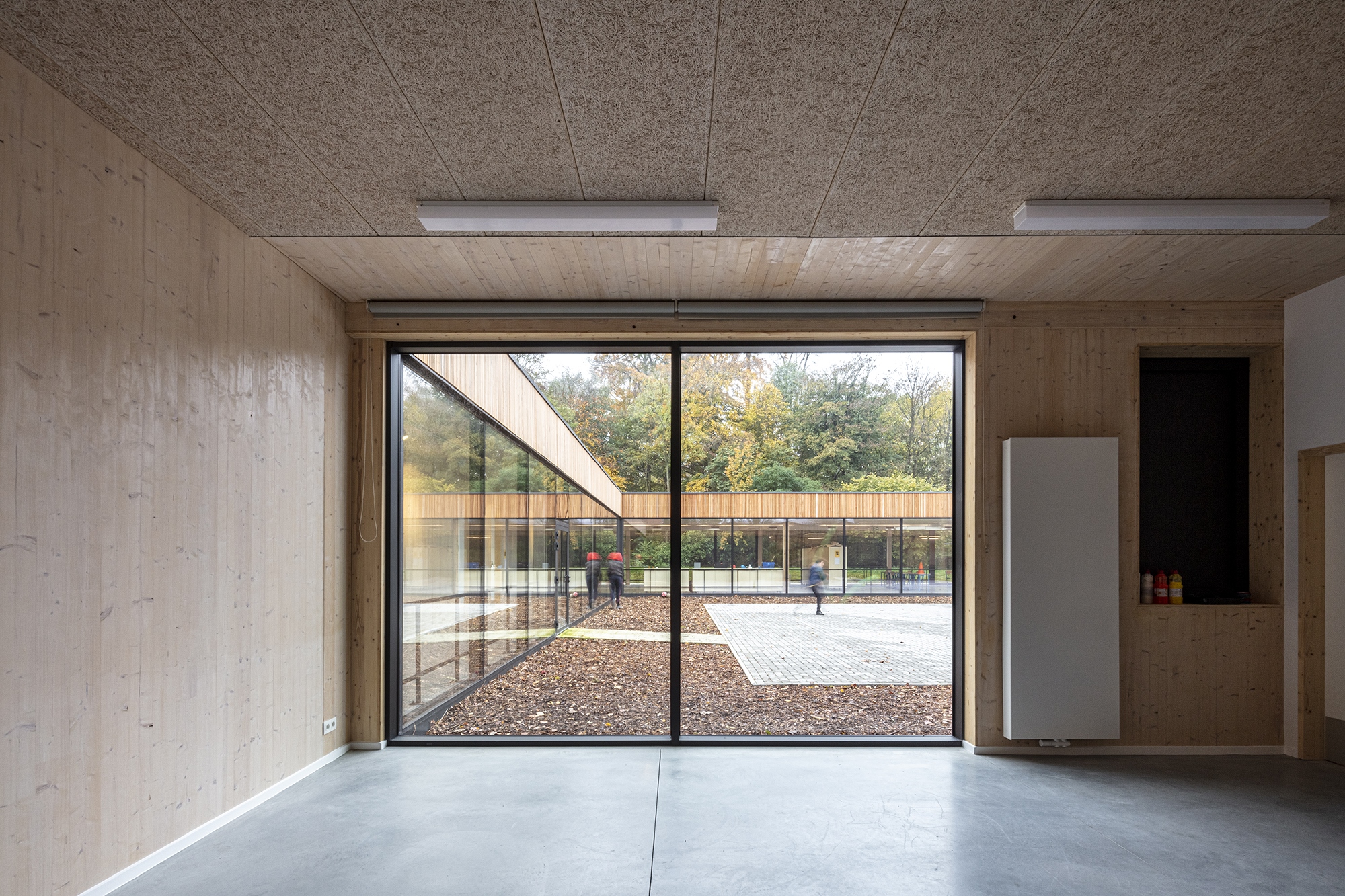 - L’école: des salles de classe flexibles et un grand couloir animé.