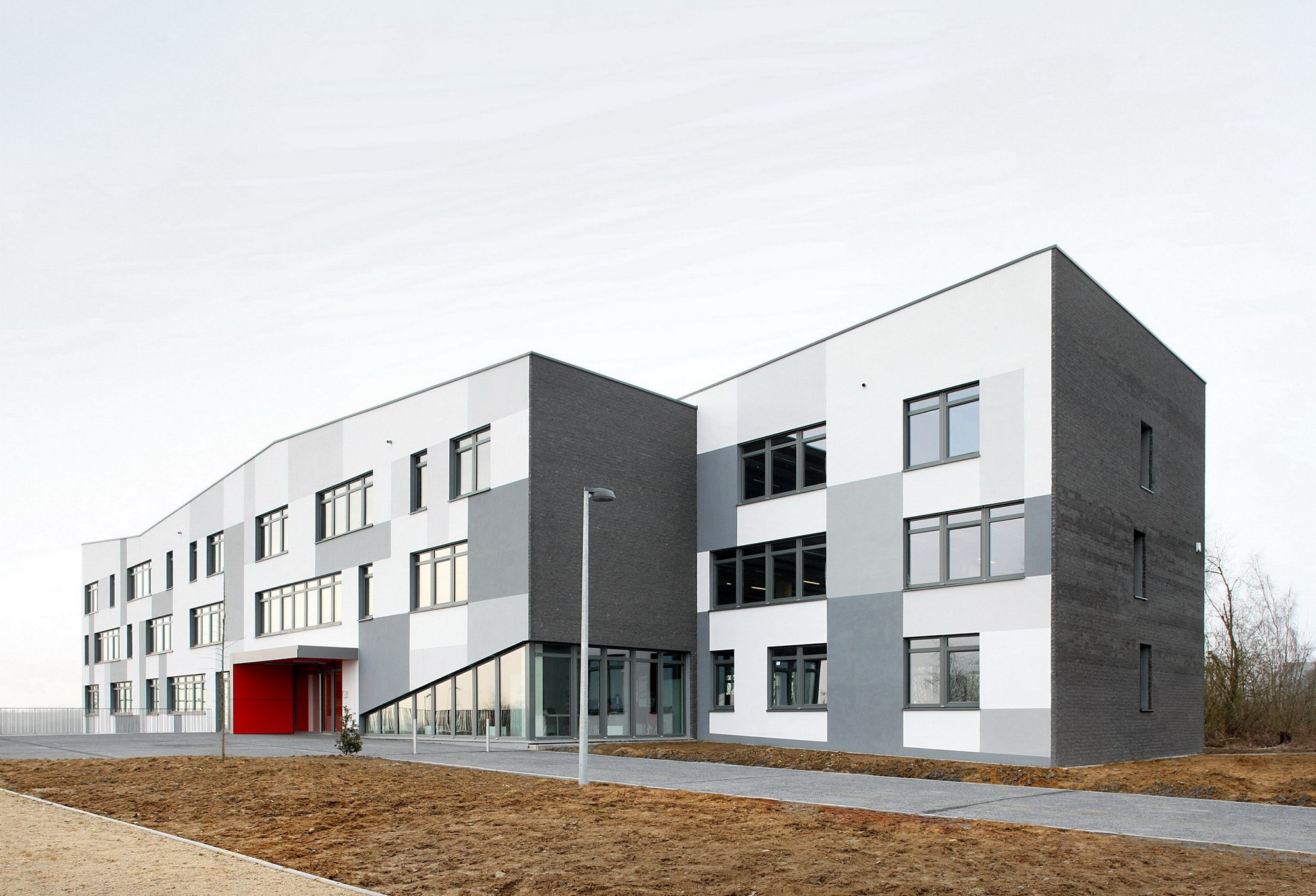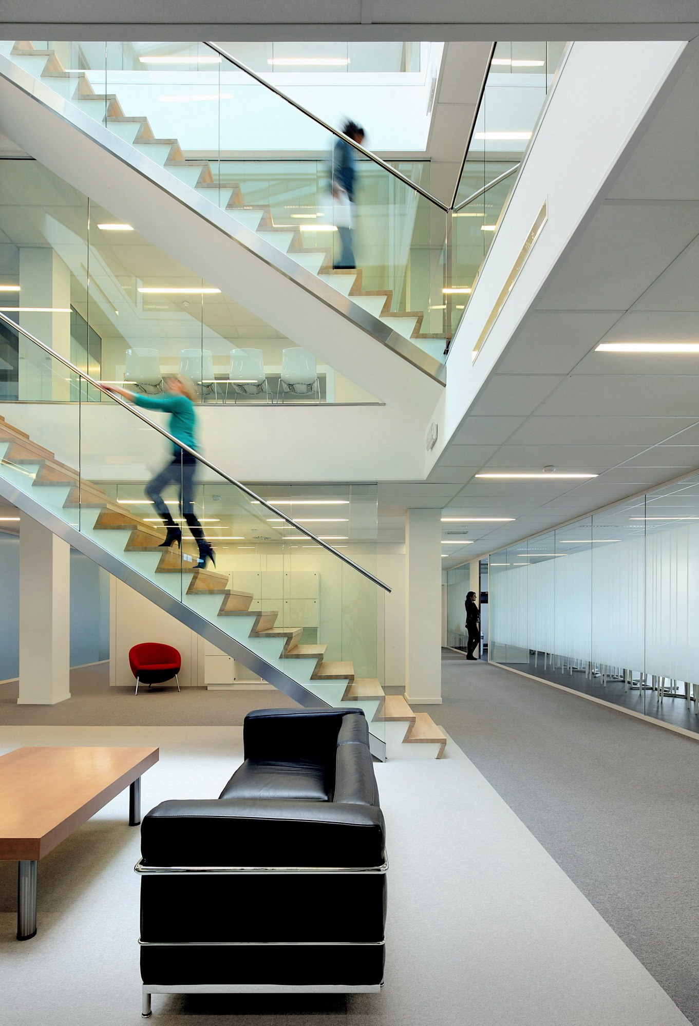 Au départ d’un simple rectangle compact, la forme est divisée dans la longueur pour former deux barrettes, décalées pour améliorer la pénétration de la lumière naturelle au cœur des plateaux. Un atrium est venu renforcer cet objectif.