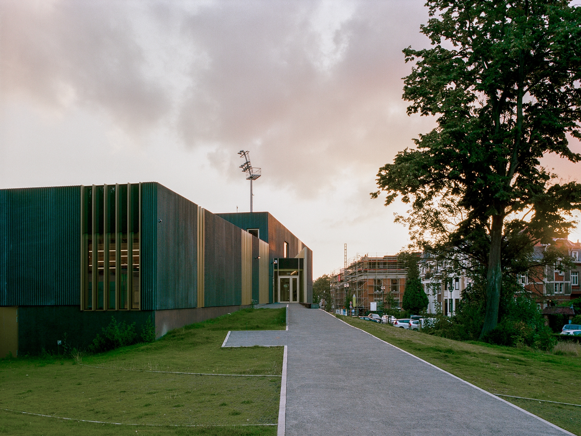 Le relief du parc nous apparaît comme une opportunité. Une entrée principale est située au niveau de la plaine de jeux et du terrain extérieur. Elle donne accès directement à l’ensemble des fonctions. Une deuxième zone située rue Renand permet d’accéder de façon directe et fonctionnelle aux locaux du personnel de gestion du parc ainsi qu’à la salle de tennis de table. Chaque fonction est accessible directement et de façon distincte.