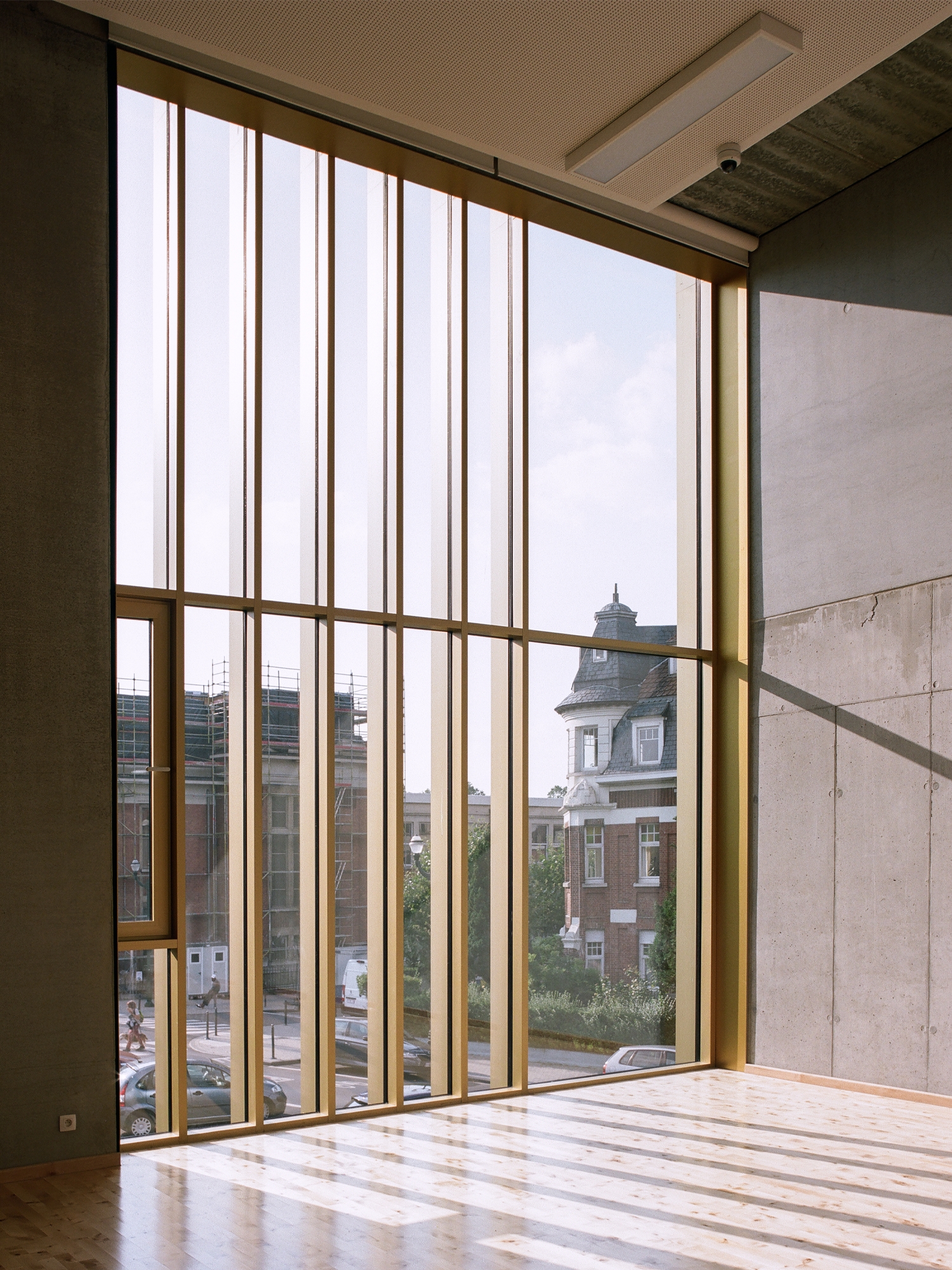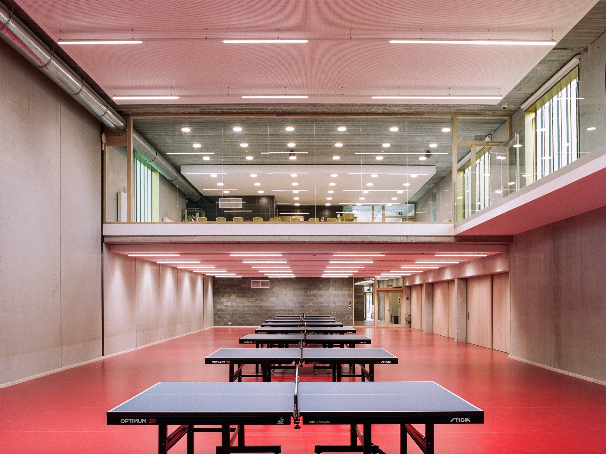 Plutôt que de subir un niveau inférieur telle une cave, nous exploitons ses caractéristiques pour y installer la salle de tennis de table qui nécessite des parois opaques en partie inférieure. Au niveau du parc, est localisée la cafétéria isolée acoustiquement et qui offre une vue généreuse sur la salle de sport. Un « balcon » démultiplie le potentiel de perception de l’espace de jeux. Cette zone permet d’apporter une lumière naturelle neutre et diffuse dans l’espace de jeux.