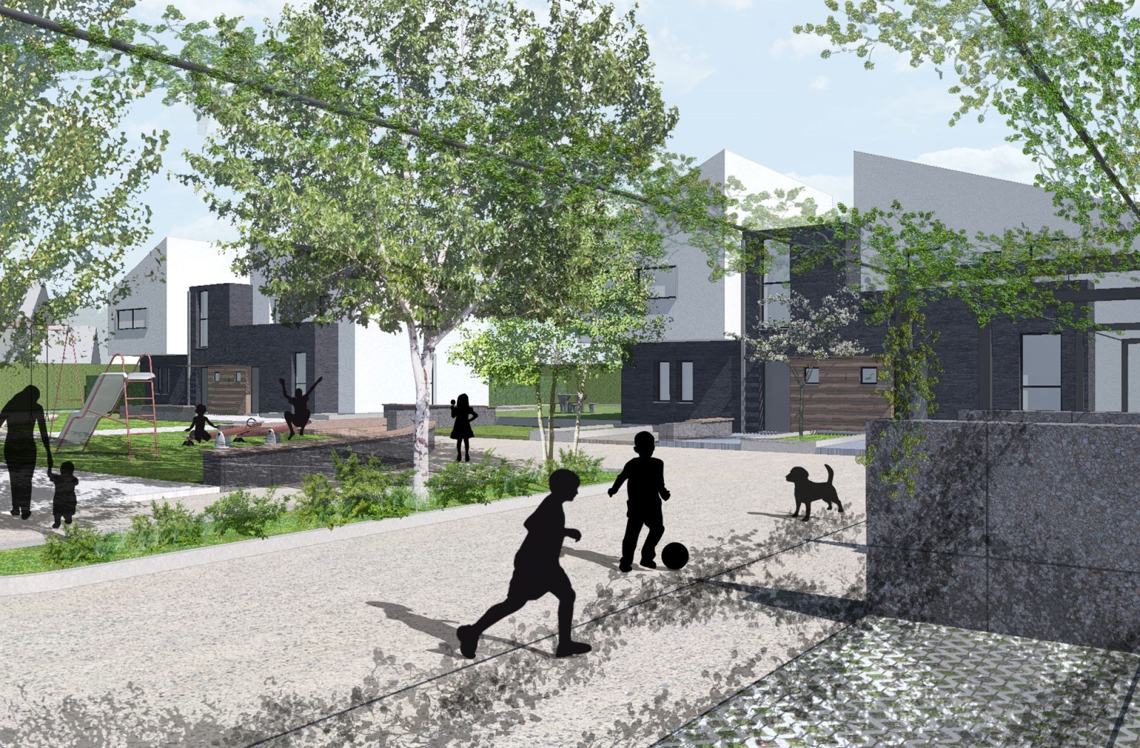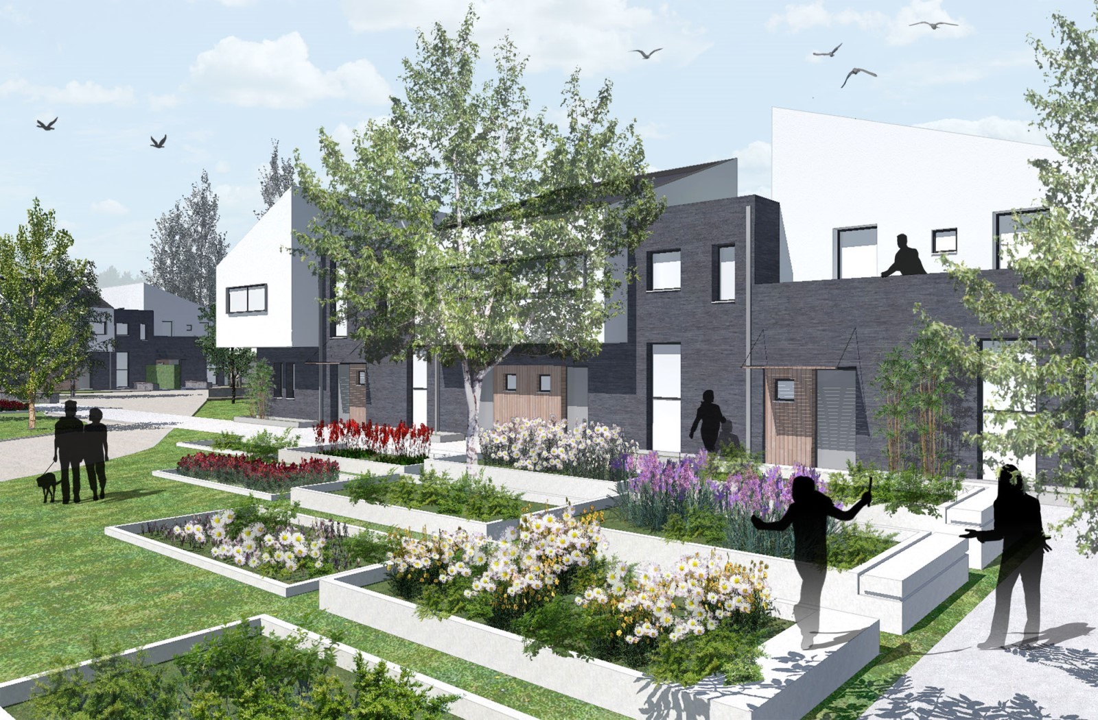 Face à la demande du maitre de l’ouvrage, nous avons fait émergé ce qui nous semble être ici l’enjeu principal : s’inscrire dans la réflexion et l’image des éco-quartiers contemporains tout en y intégrant le réalisme et les nécessités des logements sociaux (coût, maintenance, responsabilisation).