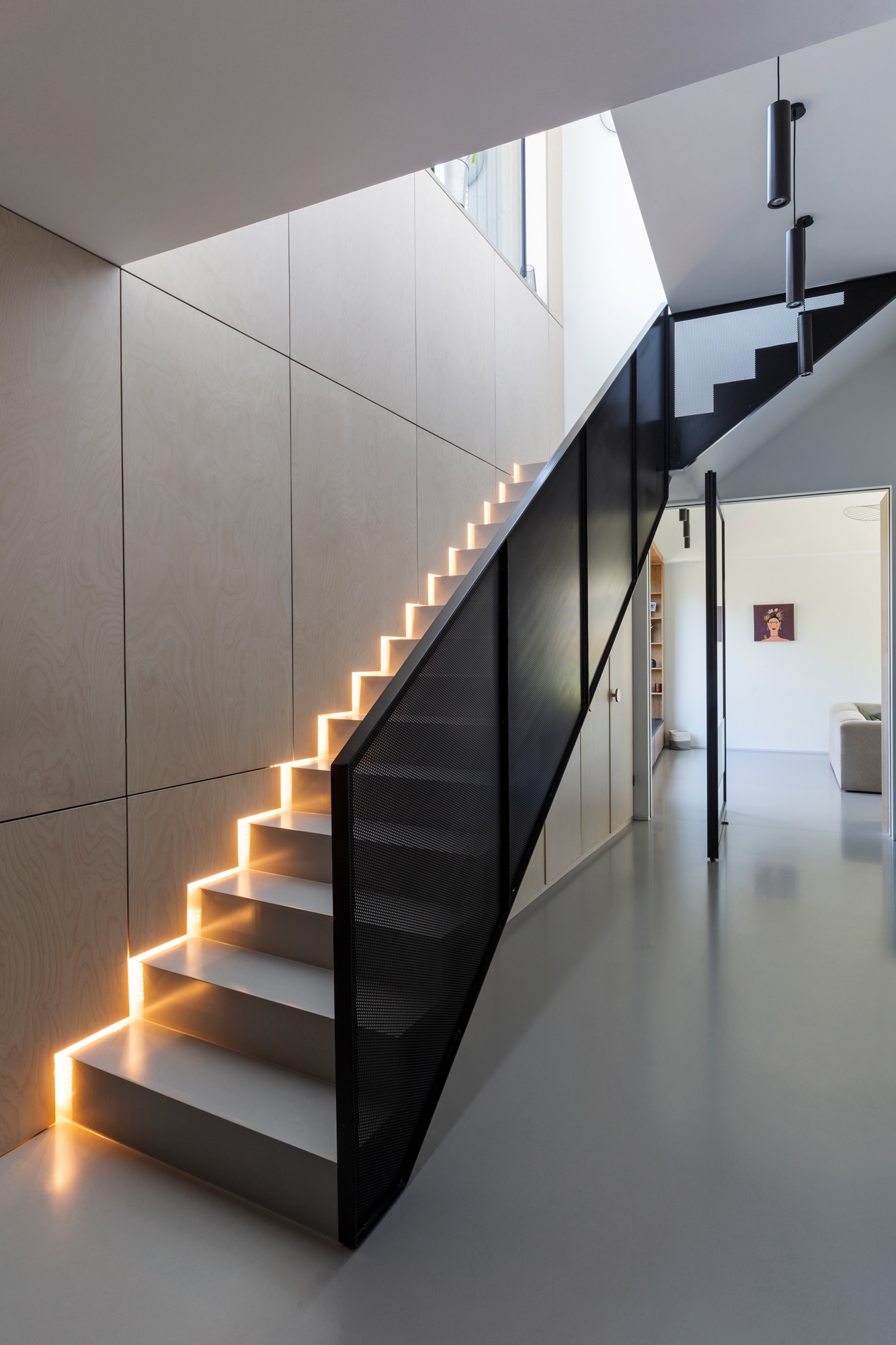 La partie de l’étage est de forme rectangulaire et est posée délicatement sur le volume inférieur.