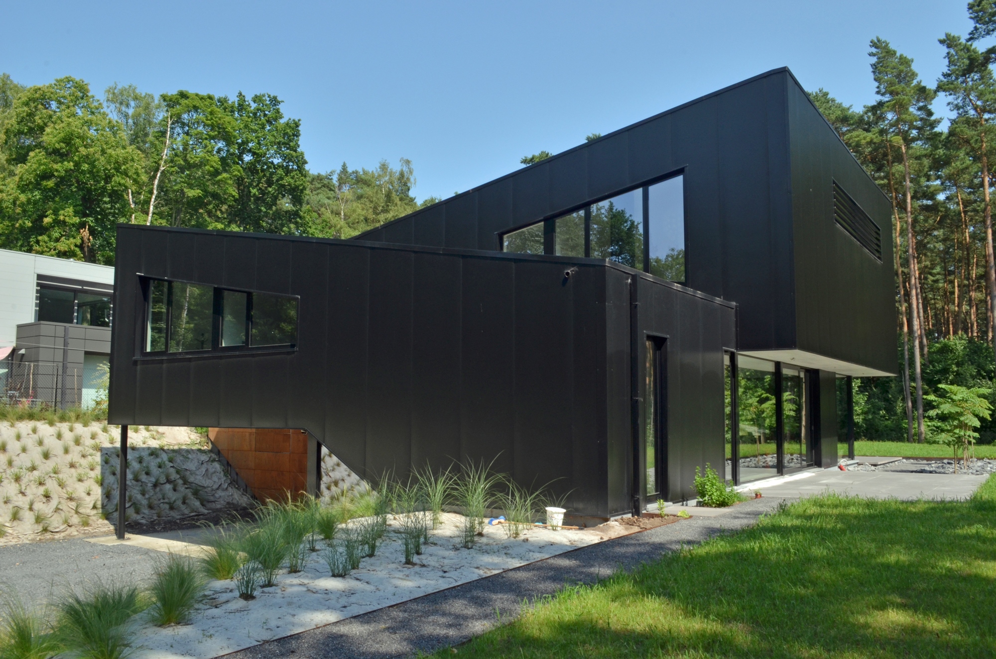 La réalisation d'une architecture oblique sert à ouvrir des perspectives vers la cime des arbres et cadrer des vues. La toiture devient la 5éme façade du bâtiment, elle permet une continuité visuel du jardin.