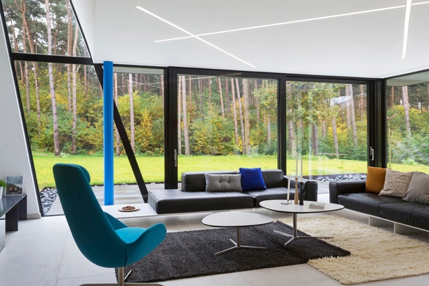 De larges baies vitrées s'ouvrent sur le jardin à l'est et au sud, non seulement, pour profiter un maximum de la nature environnante mais également pour bénéficier des apports énergétiques.