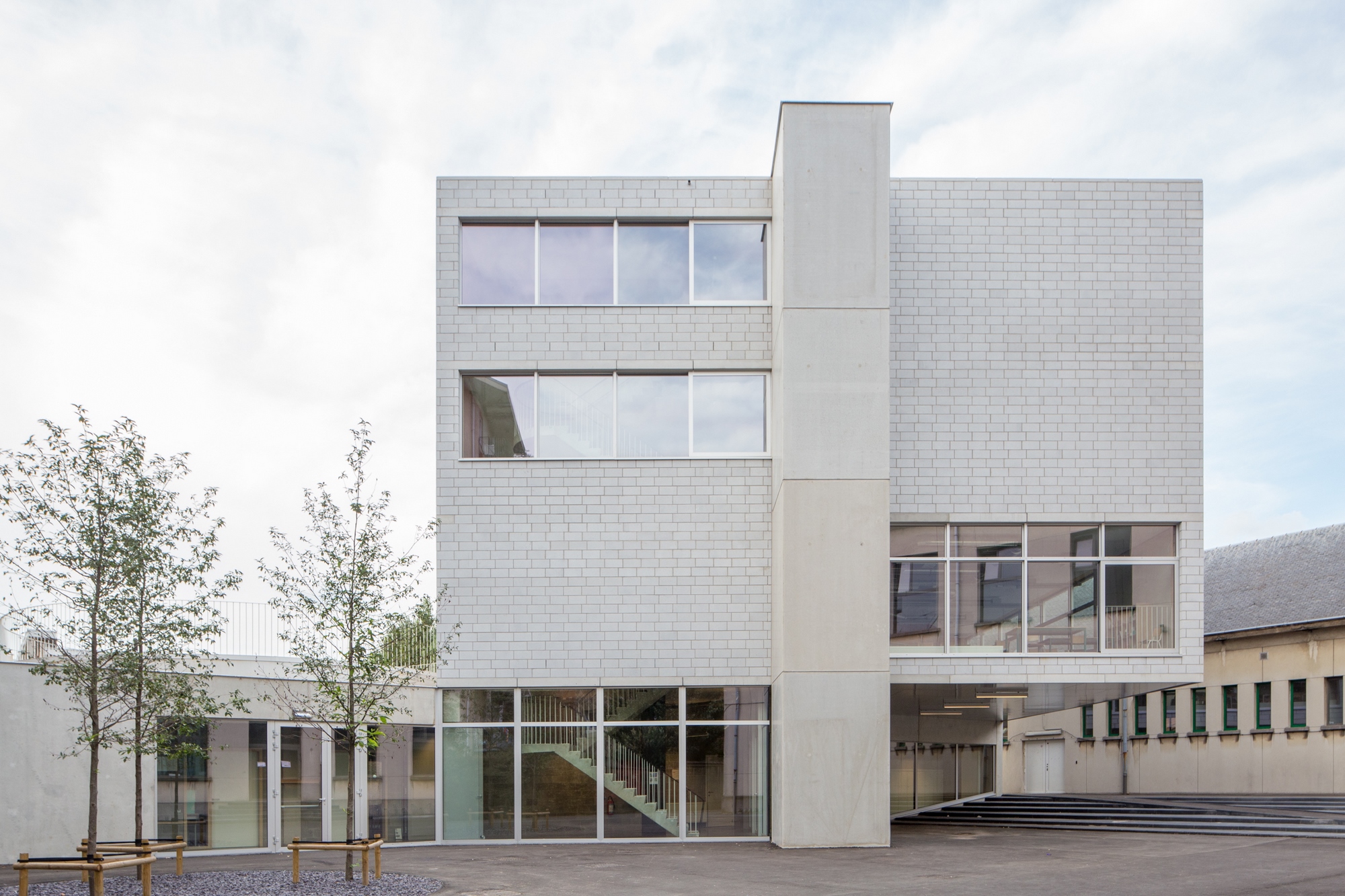 C’est ainsi qu’apparaît la position de l’exception : le socle s’inscrit dans le plan global du site et cherche à créer une cour extérieure la plus dégagée possible. Puis, le bâtiment se développe en hauteur avec 3 étages décalés de 53 ° vis à vis du socle. Le volume libère le site visuellement depuis les classes et visuellement depuis les bâtiments environnants. Les vues ne sont jamais perpendiculaires par rapport au contexte et permet ainsi des perspectives dynamiques et fraîches dans leur dialogue au contexte.