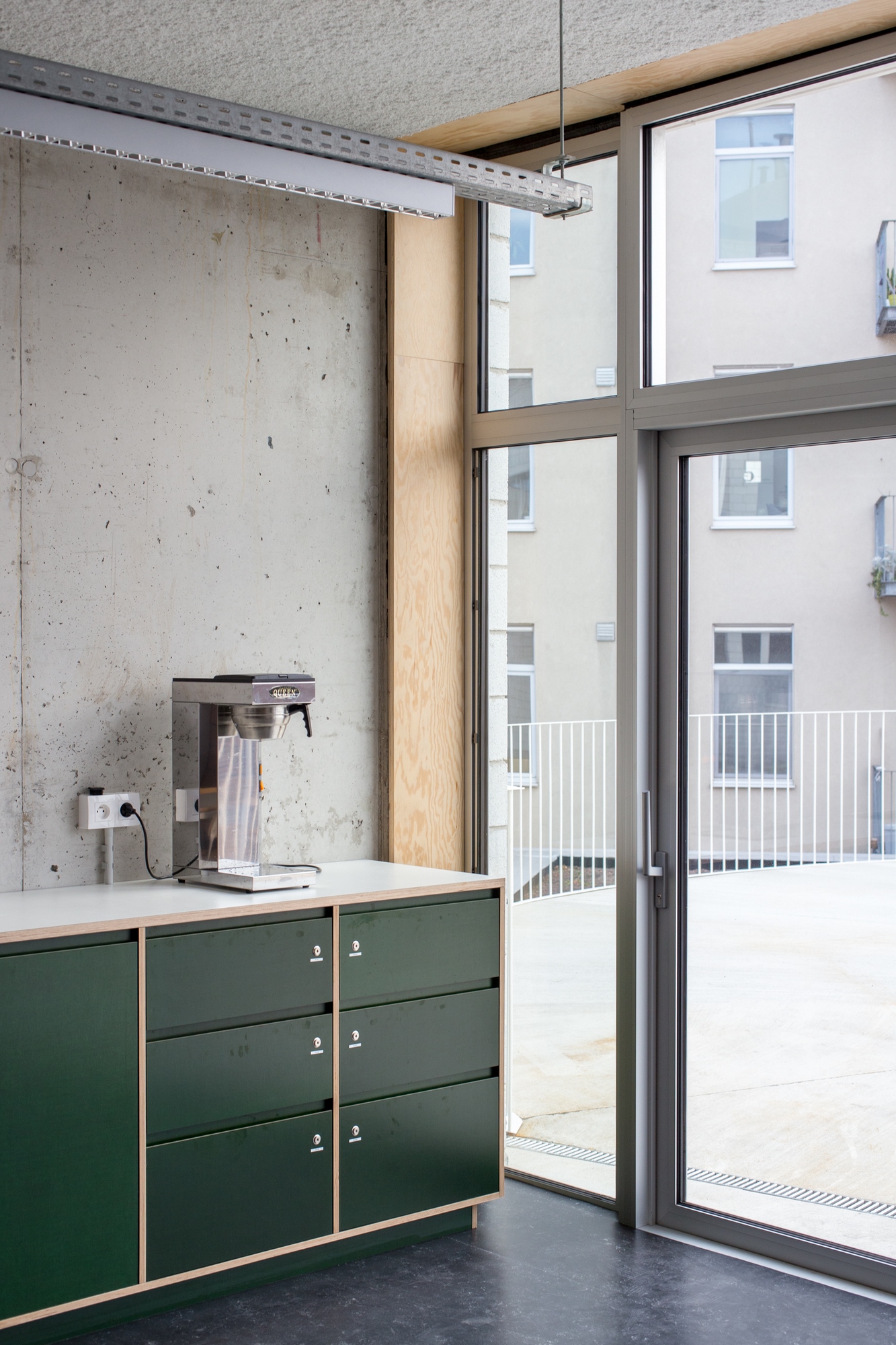 Le volume des étages marque l’entrée par son décalage, et s’inscrit dans une logique d’utilisation que l’on retrouve à toutes les échelles du projet. En intégrant une circulation intérieure efficace pour des surfaces généreuses en classes, les espaces de formation du lycée se dotent d’une autonomie et efficacité d’ensemble. Parmi ces surfaces généreuses: un grand plateau, vide, dédié à l’étude, aux travaux en groupe, aux cours de médiation, et à la cantine. Encore une fois, le tout est articulé par des vues extérieures.