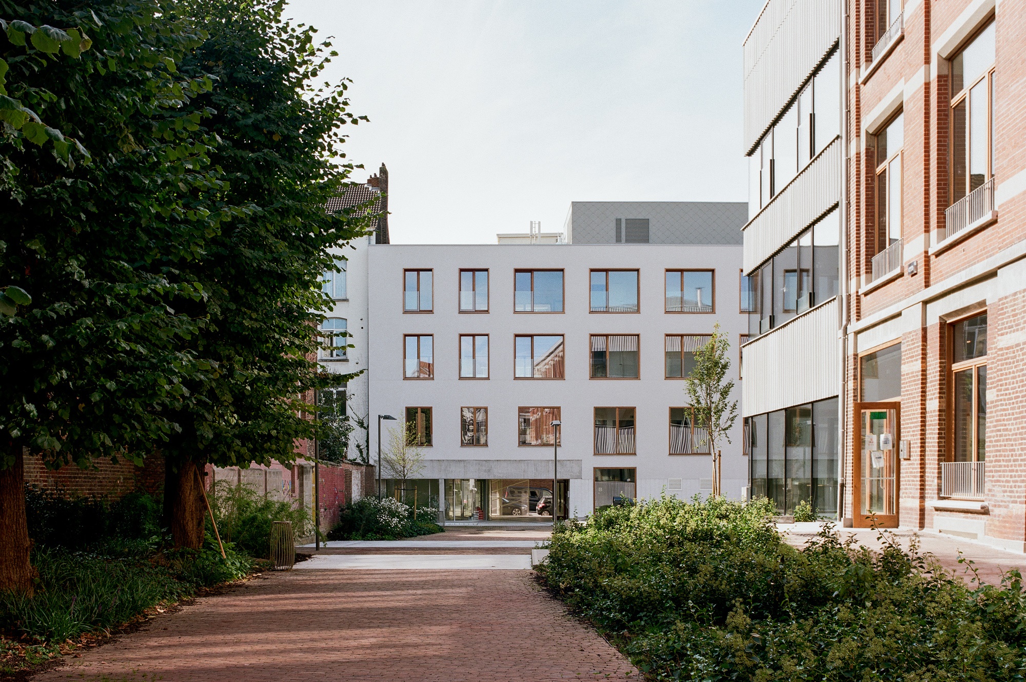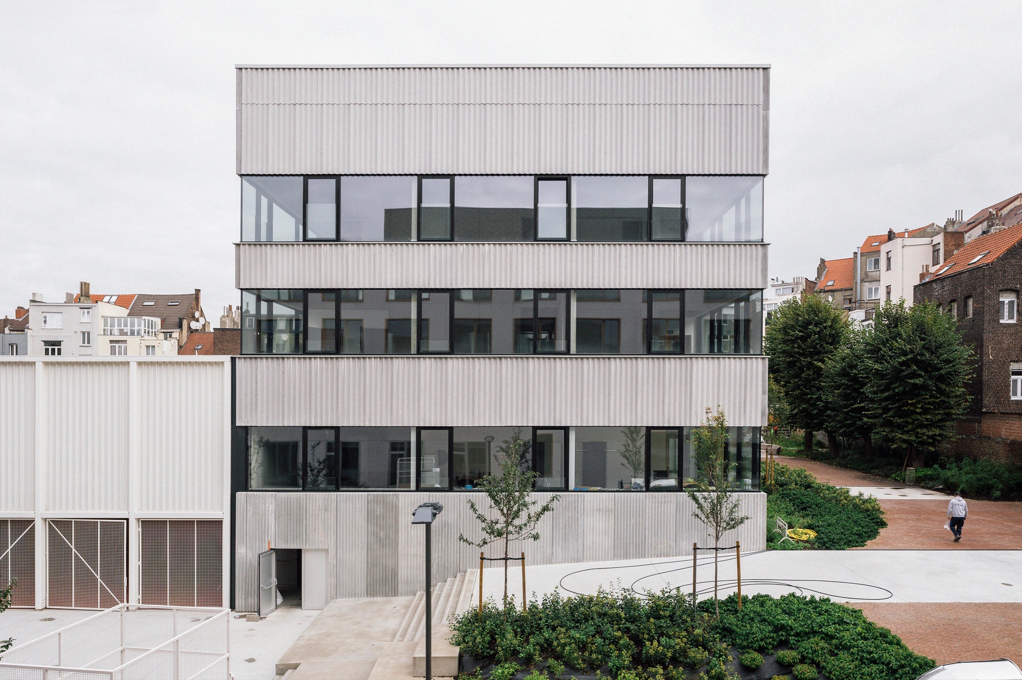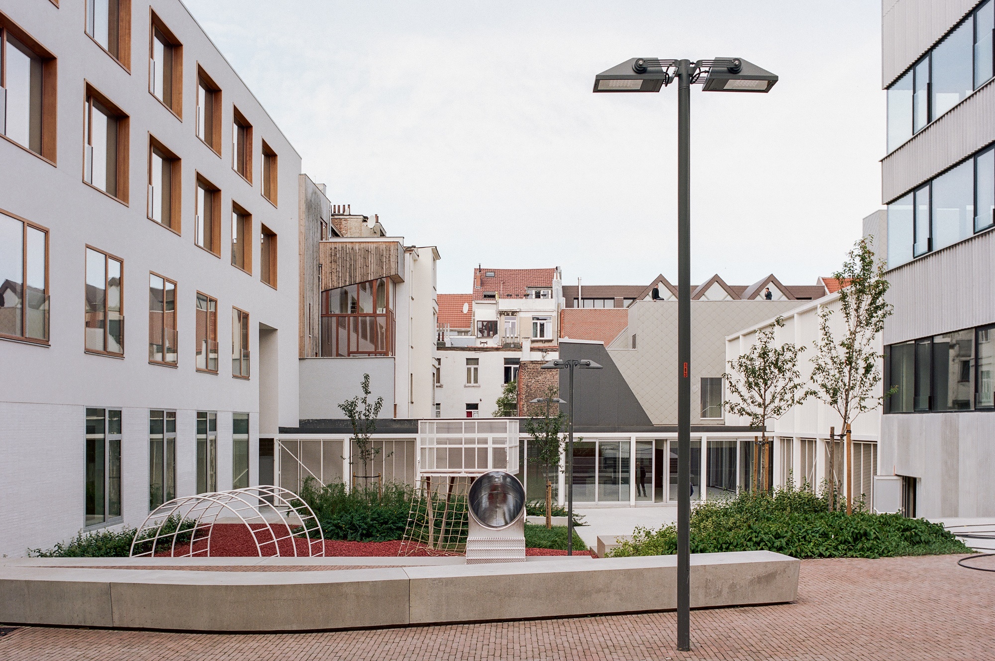 Le grand mouvement proposé est celui d’ouvrir l’îlot, de le rendre poreux et donner la possibilité aux riverains de le traverser, de profiter du parc, de la plaine de jeux et des activités du site. Avec des entrées sur site depuis trois rues différentes, des différences de niveaux et une balade paysagère, cet espace extérieur devient médiateur des accès et des usagers. Le projet est à la fois pédagogique, culturel et social, revitalisant les activités du quartier sans se déconnecter de l’îlot résidentiel dans lequel il s’insère.
