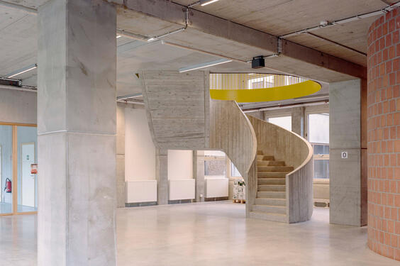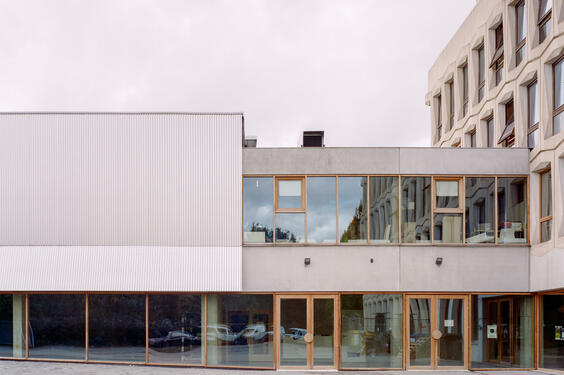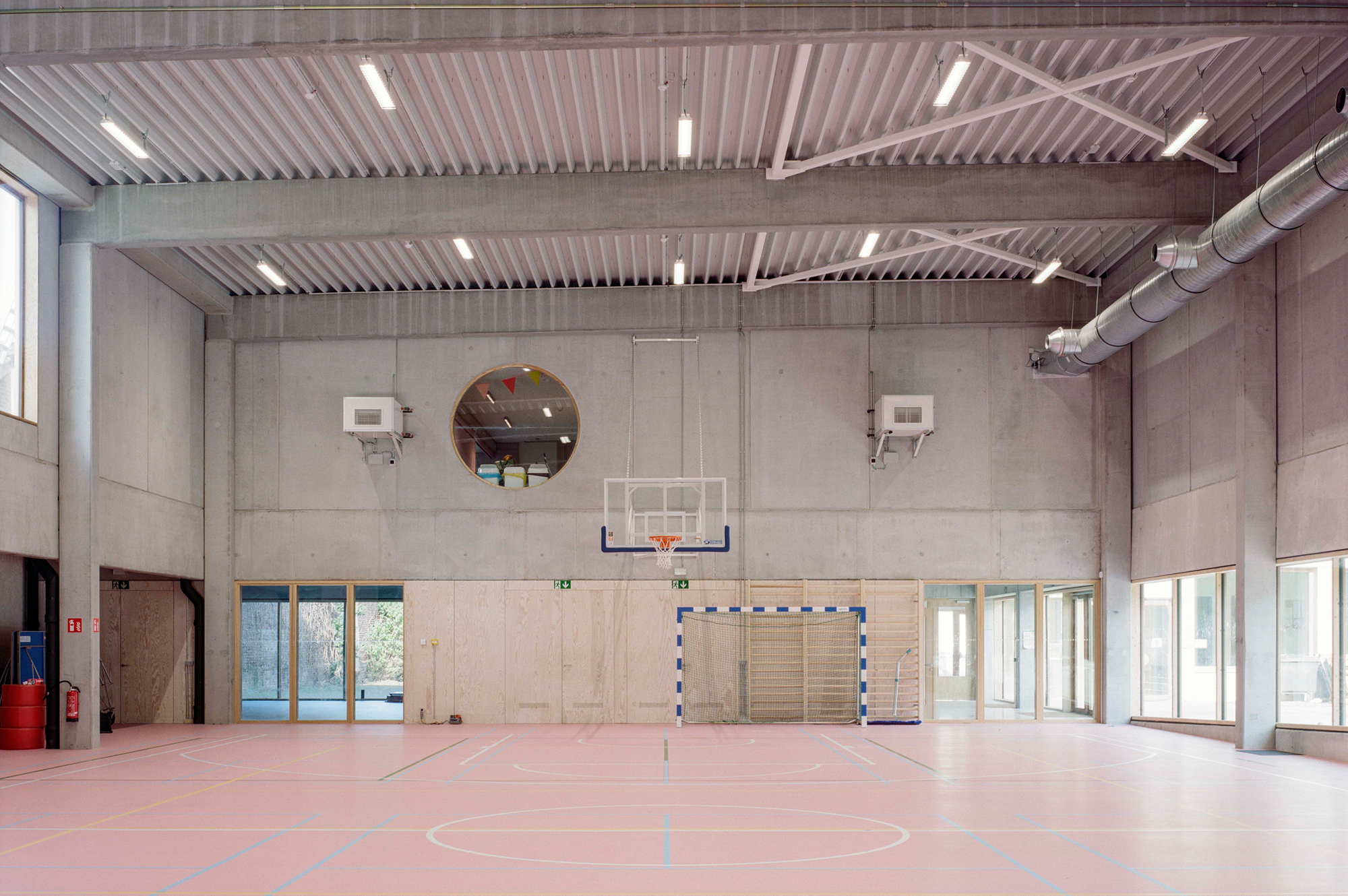 Pendant la deuxième phase, deux extensions sont ajoutées. En glissant un nouveau volume contre le mur mitoyen ouest, ce mur aveugle est activé tout en laissant le plus grand espace possible pour les cours de récréation, et crée une nouvelle visibilité depuis la rue. En outre, la nouvelle salle de sport a été placée de manière à ce qu'elle soit accessible séparément en dehors des heures de classe, ce qui ancre le projet dans le tissu social du quartier.