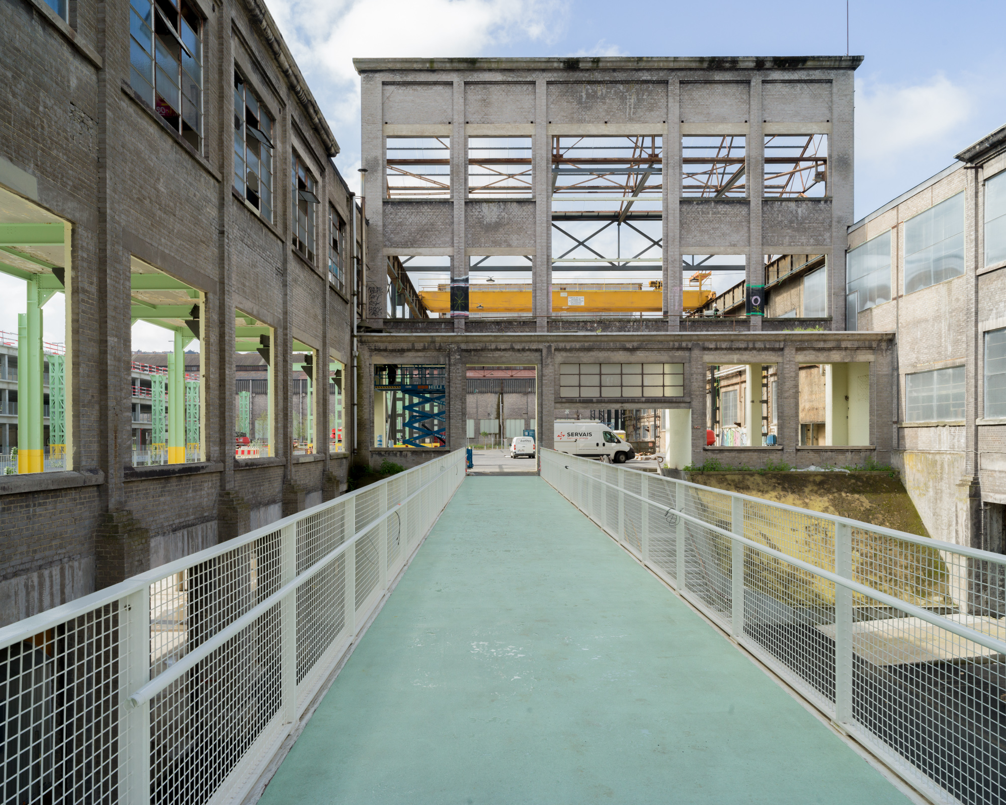 La passerelle se présente comme un axe droit simple, liant sur l’étendue du site le niveau haut des Ateliers Centraux et le parc de Trasenster. Elle est reliée au sol par des points d’accès secondaires (escaliers, rampe d’accès) permettant différents usages. Ces différents points d’accès dessinent l’espace paysager au sol. Le projet se développe en différentes zones reliées par la passerelle : 1. Le parvis des Ateliers Centraux 2. Le parvis Nicolay 3. Le chemin Trasenster. Les interventions sur le parvis inférieurs des Ateliers Centraux se limitent à l’implantation des colonnes de la passerelle et à l’éclairage de ce parvis depuis la passerelle.