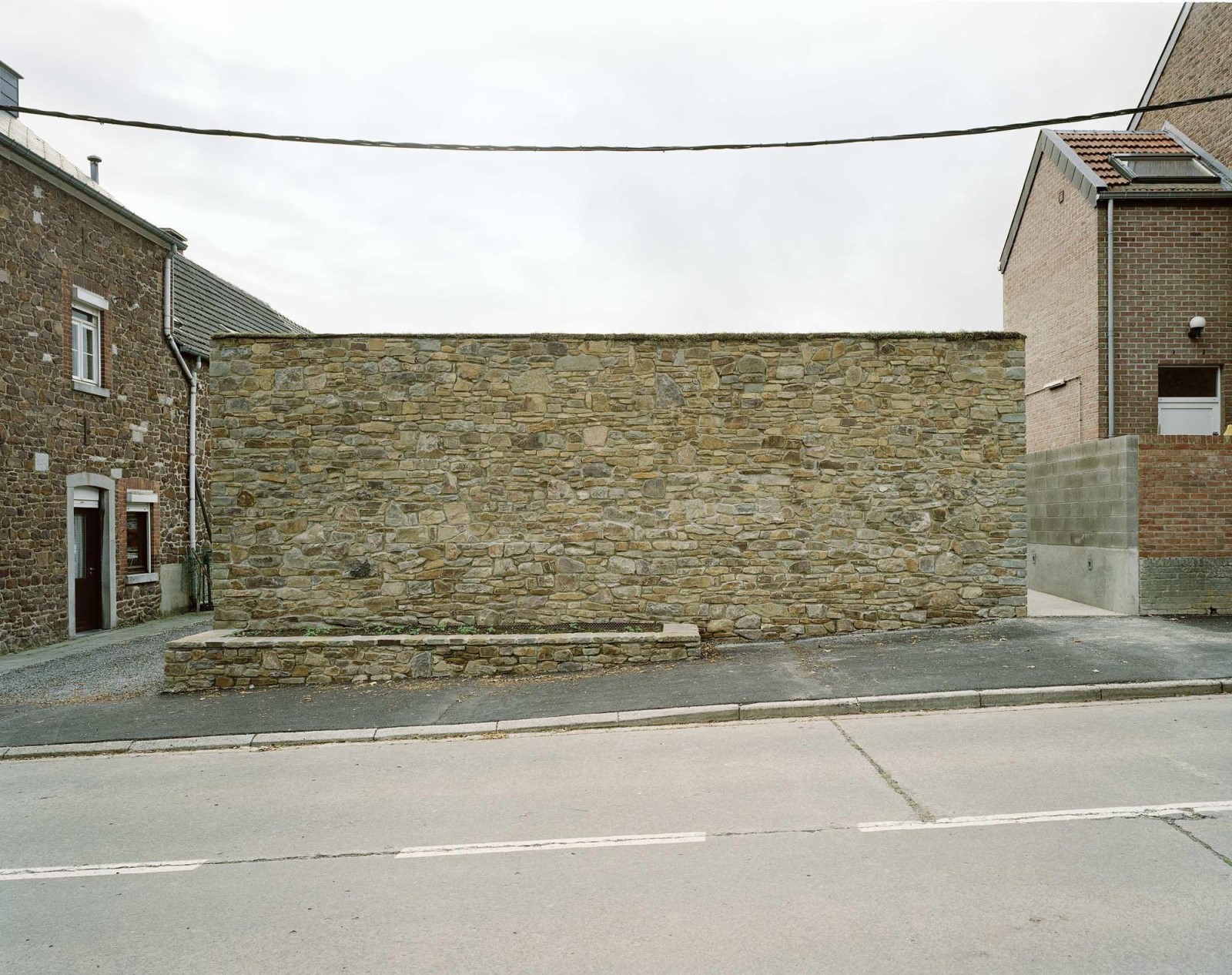 Depuis la rue, on ne perçoit que ce seul mur de clôture : plan de pierres érigé… Environ la moitié des pierres proviennent du démontage d’une petite construction, présente auparavant sur le terrain. Au travers de leur nouvel agencement, ces moellons ordinaires racontent en quelque sorte l’histoire du lieu. Leur rugosité et leur patine contrastent avec le vitrage et l’aluminium des menuiseries affleurantes. J’ai recherché la légèreté tout en construisant en pierres brutes.